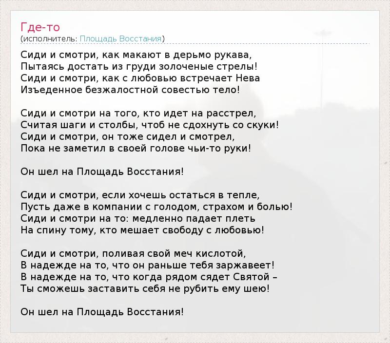 Сиди и смотри, как макают в дерьмо рукава, Пытаясь достать из груди золоченые стрелы! Сиди и смотри, как с любовью встречает Нева Изъеденное безжалостной совестью тело! Сиди и смотри на того, кто идет на расстрел, Считая шаги и столбы, чтоб не сдохнуть со скуки! Сиди и смотри, он тоже сидел и смотрел, Пока не заметил в своей голове чьи-то руки! Он шел на Площадь Восстания! Сиди и смотри, если хочешь остаться в тепле, Пусть даже в компании с голодом, страхом и болью! Сиди и смотри на то: медленно падает плеть На спину тому, кто мешает свободу с любовью! Сиди и смотри, поливая свой меч кислотой, В надежде на то, что он раньше тебя заржавеет! В надежде на то, что когда рядом сядет Святой – Ты сможешь заставить себя не рубить ему шею! Он шел на Площадь Восстания!