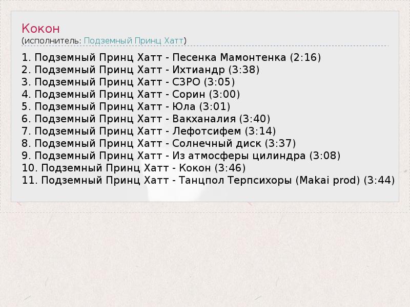1. Подземный Принц Хатт - Песенка Мамонтенка (2:16) 2. Подземный Принц Хатт - Ихтиандр (3:38) 3. Подземный Принц Хатт - C3PO (3:05) 4. Подземный Принц Хатт - Сорин (3:00) 5. Подземный Принц Хатт - Юла (3:01) 6. Подземный Принц Хатт - Вакханалия (3:40) 7. Подземный Принц Хатт - Лефотсифем (3:14) 8. Подземный Принц Хатт - Солнечный диск (3:37) 9. Подземный Принц Хатт - Из атмосферы цилиндра (3:08) 10. Подземный Принц Хатт - Кокон (3:46) 11. Подземный Принц Хатт - Танцпол Терпсихоры (Makai prod) (3:44)