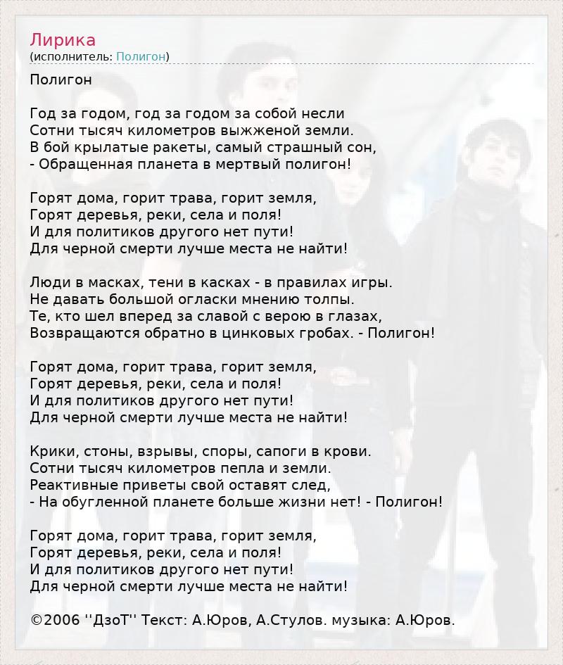 Это интересно:Группа «Полигон» – результат синтеза тяжелого гитарного звучания, мелодичности скрипки и осмысленных текстов. Именно тексты – идейная основа творчества (диалог с самим собой о внутренних противоречиях, высказывание своей жизненной и гражданской позиции – основная тематика песен).Участники никак не определяют музыкальный стиль коллектива. Определенный колорит вносит многофункциональность... продолжение
