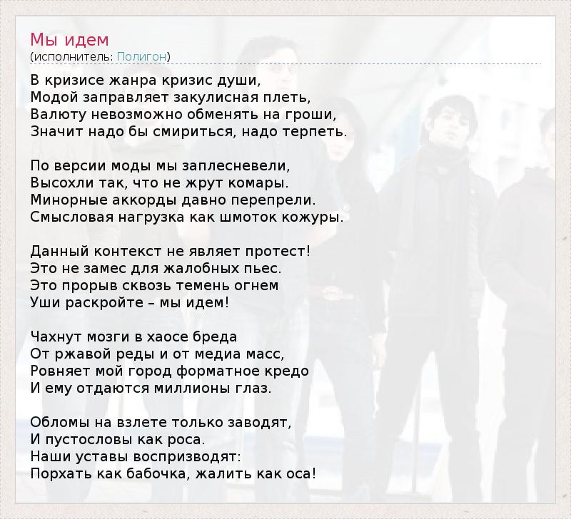 В кризисе жанра кризис души, Модой заправляет закулисная плеть, Валюту невозможно обменять на гроши, Значит надо бы смириться, надо терпеть. По версии моды мы заплесневели, Высохли так, что не жрут комары. Минорные аккорды давно перепрели. Смысловая нагрузка как шмоток кожуры. Данный контекст не являет протест! Это не замес для жалобных пьес. Это прорыв сквозь темень огнем Уши раскройте – мы идем! Чахнут мозги в хаосе бреда От ржавой реды и от медиа масс, Ровняет мой город форматное кредо И ему отдаются миллионы глаз. Обломы на взлете только заводят, И пустословы как роса. Наши уставы воспризводят: Порхать как бабочка, жалить как оса!