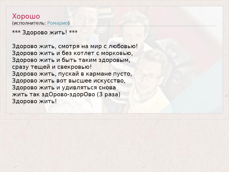 *** Здорово жить! *** Здорово жить, смотря на мир с любовью! Здорово жить и без котлет с морковью, Здорово жить и быть таким здоровым, сразу тещей и свекровью! Здорово жить, пускай в кармане пусто, Здорово жить вот высшее искусство, Здорово жить и удивляться снова жить так здОрово-здорОво (3 раза) Здорово жить!
