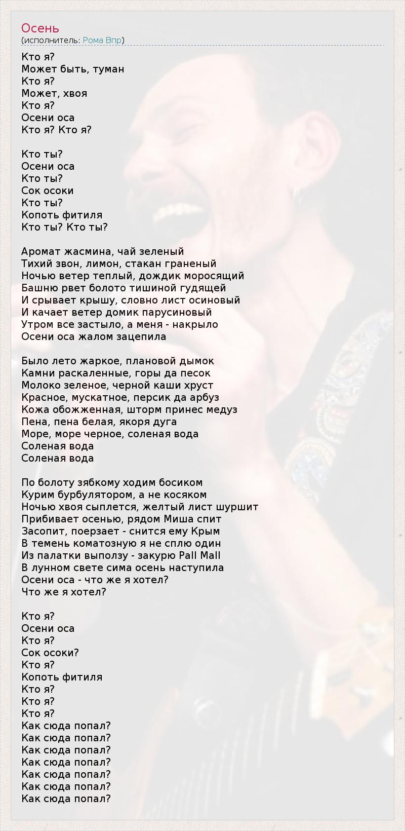 Кто я? Может быть, туман Кто я? Может, хвоя Кто я? Осени оса Кто я? Кто я? Кто ты? Осени оса Кто ты? Сок осоки Кто ты? Копоть фитиля Кто ты? Кто ты? Аромат жасмина, чай зеленый Тихий звон, лимон, стакан граненый Ночью ветер теплый, дождик моросящий Башню рвет болото тишиной гудящей И срывает крышу, словно лист осиновый И качает ветер домик парусиновый Утром все застыло, а меня - накрыло Осени оса жалом зацепила Было лето жаркое, плановой дымок Камни раскаленные, горы да песок Молоко зеленое, черной каши хруст Красное, мускатное, персик да арбуз Кожа обожженная, шторм принес медуз Пена, пена белая, якоря дуга Море, море черное, соленая вода Соленая вода Соленая вода По болоту зябкому ходим босиком Курим бурбулятором, а не косяком Ночью хвоя сыплется, желтый лист шуршит Прибивает осенью, рядом Миша спит Засопит, поерзает - снится ему Крым В темень коматозную я не сплю один Из палатки выползу - закурю Pall Mall В лунном свете сима осень наступила Осени оса - что же я хотел? Что же я хотел? Кто я? Осени оса Кто я? Сок осоки? Кто я? Копоть фитиля Кто я? Кто я? Кто я? Как сюда попал? Как сюда попал? Как сюда попал? Как сюда попал? Как сюда попал? Как сюда попал? Как сюда попал?