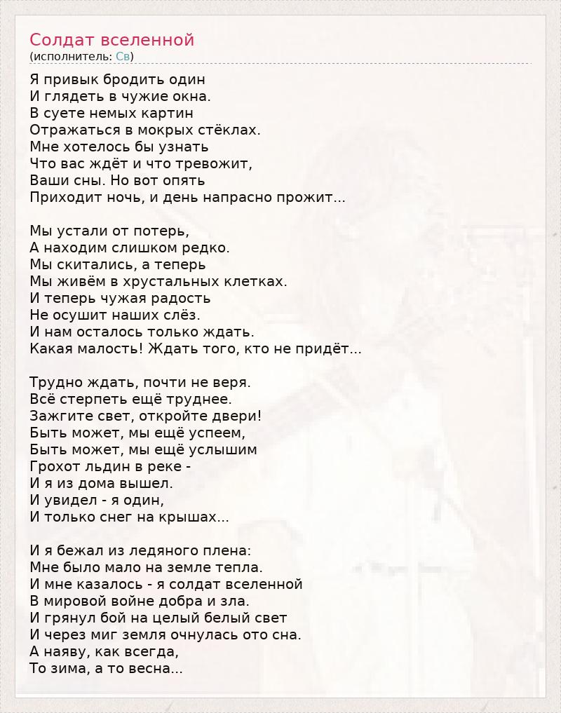 Я привык бродить один И глядеть в чужие окна. В суете немых картин Отражаться в мокрых стёклах. Мне хотелось бы узнать Что вас ждёт и что тревожит, Ваши сны. Но вот опять Приходит ночь, и день напрасно прожит... Мы устали от потерь, А находим слишком редко. Мы скитались, а теперь Мы живём в хрустальных клетках. И теперь чужая радость Не осушит наших слёз. И нам осталось только ждать. Какая малость! Ждать того, кто не придёт... Трудно ждать, почти не веря. Всё стерпеть ещё труднее. Зажгите свет, откройте двери! Быть может, мы ещё успеем, Быть может, мы ещё услышим Грохот льдин в реке - И я из дома вышел. И увидел - я один, И только снег на крышах... И я бежал из ледяного плена: Мне было мало на земле тепла. И мне казалось - я солдат вселенной В мировой войне добра и зла. И грянул бой на целый белый свет И через миг земля очнулась ото сна. А наяву, как всегда, То зима, а то весна...
