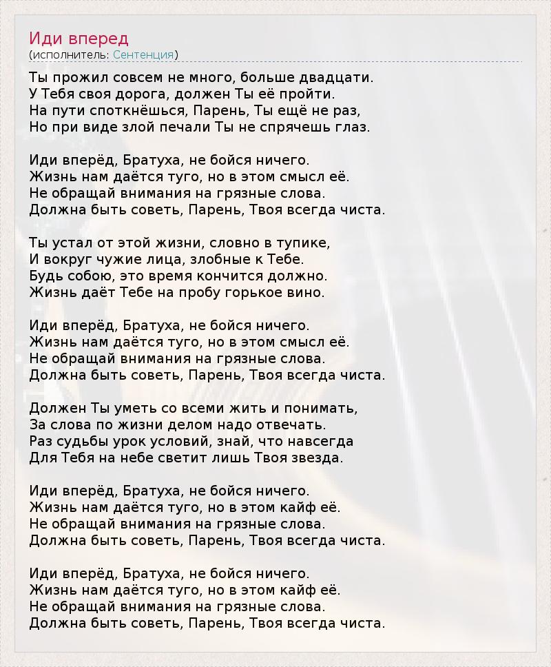Ты прожил совсем не много, больше двадцати. У Тебя своя дорога, должен Ты её пройти. На пути споткнёшься, Парень, Ты ещё не раз, Но при виде злой печали Ты не спрячешь глаз. Иди вперёд, Братуха, не бойся ничего. Жизнь нам даётся туго, но в этом смысл её. Не обращай внимания на грязные слова. Должна быть советь, Парень, Твоя всегда чиста. Ты устал от этой жизни, словно в тупике, И вокруг чужие лица, злобные к Тебе. Будь собою, это время кончится должно. Жизнь даёт Тебе на пробу горькое вино. Иди вперёд, Братуха, не бойся ничего. Жизнь нам даётся туго, но в этом смысл её. Не обращай внимания на грязные слова. Должна быть советь, Парень, Твоя всегда чиста. Должен Ты уметь со всеми жить и понимать, За слова по жизни делом надо отвечать. Раз судьбы урок условий, знай, что навсегда Для Тебя на небе светит лишь Твоя звезда. Иди вперёд, Братуха, не бойся ничего. Жизнь нам даётся туго, но в этом кайф её. Не обращай внимания на грязные слова. Должна быть советь, Парень, Твоя всегда чиста. Иди вперёд, Братуха, не бойся ничего. Жизнь нам даётся туго, но в этом кайф её. Не обращай внимания на грязные слова. Должна быть советь, Парень, Твоя всегда чиста.