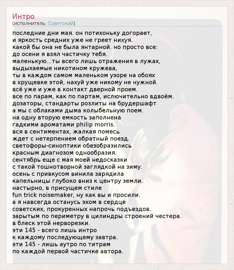 Это интересно:Персона Советского являет собой постоянный эксперимент: представитель рэпа не для всех, поэтому предпочитает закрутить всё, словно клубы дыма, начиная от рифм и заканчивая смысловой нагрузкой текста.