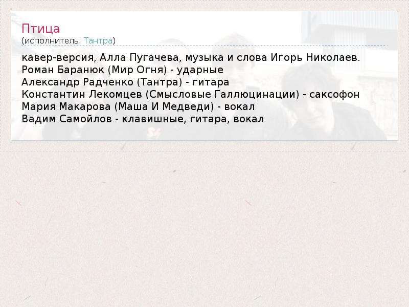 кавер-версия, Алла Пугачева, музыка и слова Игорь Николаев. Роман Баранюк (Мир Огня) - ударные Александр Радченко (Тантра) - гитара Константин Лекомцев (Смысловые Галлюцинации) - саксофон Мария Макарова (Маша И Медведи) - вокал Вадим Самойлов - клавишные, гитара, вокал