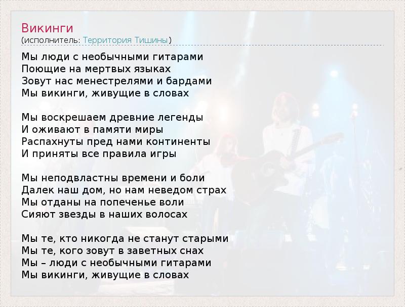 Мы люди с необычными гитарами Поющие на мертвых языках Зовут нас менестрелями и бардами Мы викинги, живущие в словах Мы воскрешаем древние легенды И оживают в памяти миры Распахнуты пред нами континенты И приняты все правила игры Мы неподвластны времени и боли Далек наш дом, но нам неведом страх Мы отданы на попеченье воли Сияют звезды в наших волосах Мы те, кто никогда не станут старыми Мы те, кого зовут в заветных снах Мы – люди с необычными гитарами Мы викинги, живущие в словах