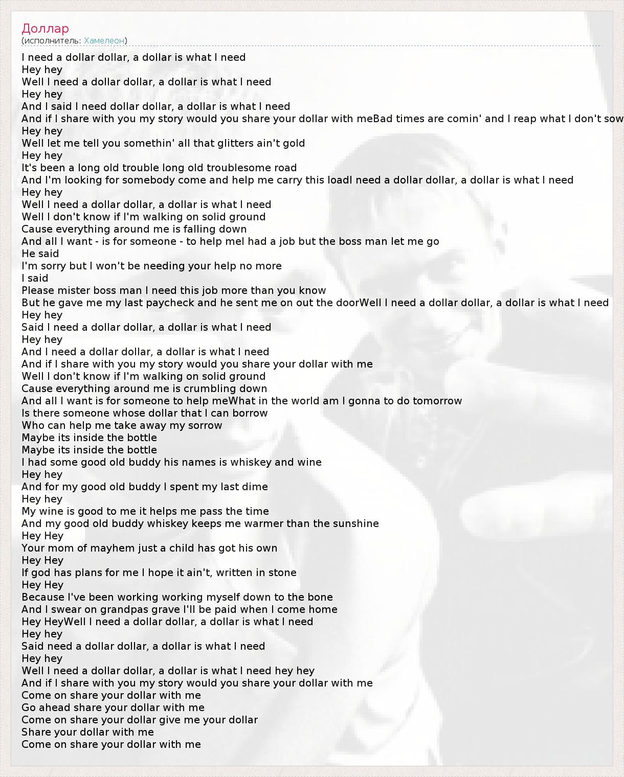 I need a dollar dollar, a dollar is what I need Hey hey Well I need a dollar dollar, a dollar is what I need Hey hey And I said I need dollar dollar, a dollar is what I need And if I share with you my story would you share your dollar with meBad times are comin' and I reap what I don't sow Hey hey Well let me tell you somethin' all that glitters ain't gold Hey hey It's been a long old trouble long old troublesome road And I'm looking for somebody come and help me carry this loadI need a dollar dollar, a dollar is what I need Hey hey Well I need a dollar dollar, a dollar is what I need Well I don't know if I'm walking on solid ground Cause everything around me is falling down And all I want - is for someone - to help meI had a job but the boss man let me go He said I'm sorry but I won't be needing your help no more I said Please mister boss man I need this job more than you know But he gave me my last paycheck and he sent me on out the doorWell I need a dollar dollar, a dollar is what I need Hey hey Said I need a dollar dollar, a dollar is what I need Hey hey And I need a dollar dollar, a dollar is what I need And if I share with you my story would you share your dollar with me Well I don't know if I'm walking on solid ground Cause everything around me is crumbling down And all I want is for someone to help meWhat in the world am I gonna to do tomorrow Is there someone whose dollar that I can borrow Who can help me take away my sorrow Maybe its inside the bottle Maybe its inside the bottle I had some good old buddy his names is whiskey and wine Hey hey And for my good old buddy I spent my last dime Hey hey My wine is good to me it helps me pass the time And my good old buddy whiskey keeps me warmer than the sunshine Hey Hey Your mom of mayhem just a child has got his own Hey Hey If god has plans for me I hope it ain't, written in stone Hey Hey Because I've been working working myself down to the bone And I swear on grandpas grave I'll be paid when I come home Hey HeyWell I need a dollar dollar, a dollar is what I need Hey hey Said need a dollar dollar, a dollar is what I need Hey hey Well I need a dollar dollar, a dollar is what I need hey hey And if I share with you my story would you share your dollar with me Come on share your dollar with me Go ahead share your dollar with me Come on share your dollar give me your dollar Share your dollar with me Come on share your dollar with me