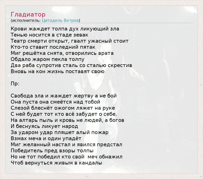 А как ты думаешь, о чем песня "Гладиатор" ?