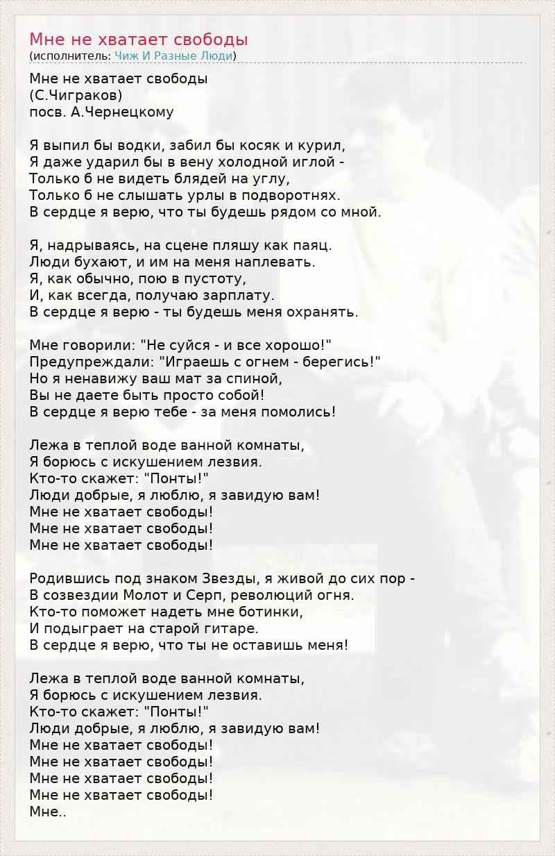 Мне не хватает свободы (С.Чиграков) посв. А.Чернецкому Я выпил бы водки, забил бы косяк и курил, Я даже ударил бы в вену холодной иглой - Только б не видеть блядей на углу, Только б не слышать урлы в подворотнях. В сердце я верю, что ты будешь рядом со мной. Я, надрываясь, на сцене пляшу как паяц. Люди бухают, и им на меня наплевать. Я, как обычно, пою в пустоту, И, как всегда, получаю зарплату. В сердце я верю - ты будешь меня охранять. Мне говорили: "Не суйся - и все хорошо!" Предупреждали: "Играешь с огнем - берегись!" Но я ненавижу ваш мат за спиной, Вы не даете быть просто собой! В сердце я верю тебе - за меня помолись! Лежа в теплой воде ванной комнаты, Я борюсь с искушением лезвия. Кто-то скажет: "Понты!" Люди добрые, я люблю, я завидую вам! Мне не хватает свободы! Мне не хватает свободы! Мне не хватает свободы! Родившись под знаком Звезды, я живой до сих пор - В созвездии Молот и Серп, революций огня. Кто-то поможет надеть мне ботинки, И подыграет на старой гитаре. В сердце я верю, что ты не оставишь меня! Лежа в теплой воде ванной комнаты, Я борюсь с искушением лезвия. Кто-то скажет: "Понты!" Люди добрые, я люблю, я завидую вам! Мне не хватает свободы! Мне не хватает свободы! Мне не хватает свободы! Мне не хватает свободы! Мне..