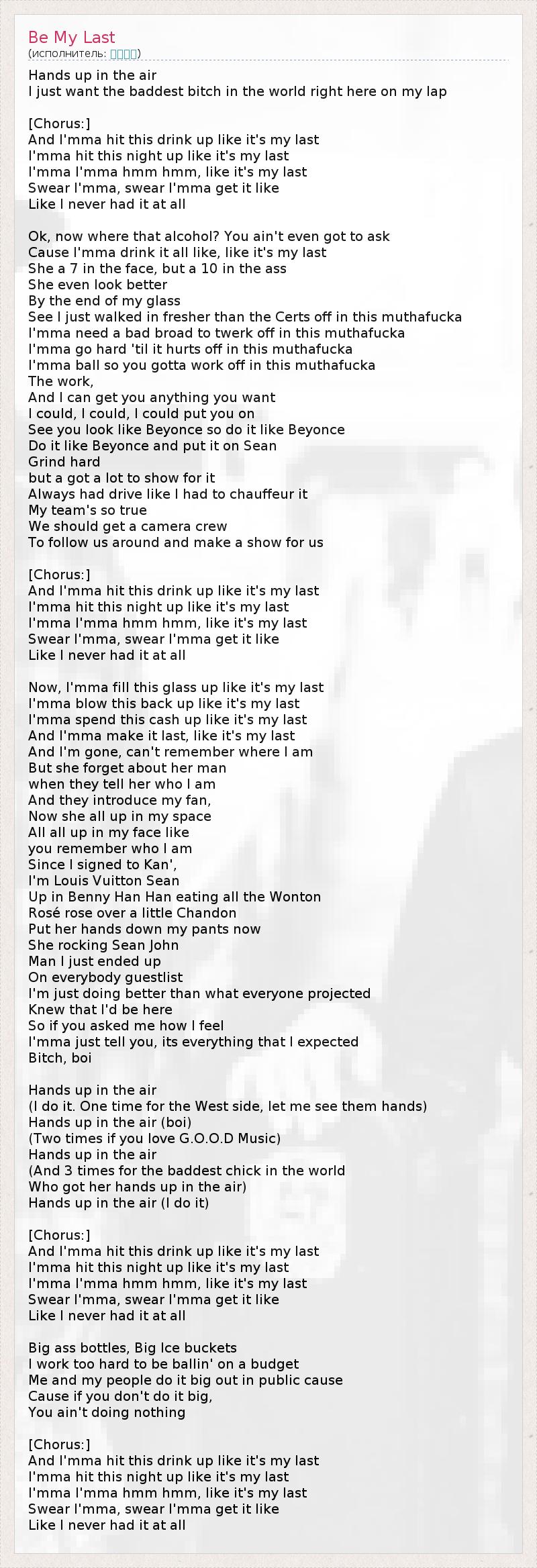 Поднимите руки выше, Я хочу посадить к себе на колени самую горячую девчонку. [Припев:] И я буду опрокидывать стопку, как будто она последняя, Я проживу эту ночь так, как будто она последняя, Я буду делать "хмм, хмм", как в последний раз, Клянусь, я буду благодарен за все, что получаю, Как будто у меня этого никогда не было. ОК, я думаю, всем понятно, куда делся алкоголь – Я пил словно в последний раз. У нее толстенное лицо и за*ница, Но она начинает выглядеть лучше, После того, как я пропускаю стаканчик. Я выгляжу даже свежее, чем мятный Certs, Мне нужна женщина, с которой можно зажечь, Да так усердно, чтоб все потом болело, черт возьми. Я задам такой темп, что ты выдохнешься, черт возьми, На этой "работе", И я могу достать для тебя все, что хочешь, Могу продвинуть тебя. Ты выглядишь круто, как Бейонсе, так будь как Бейонсе, Делай это, как Бейонсе с Шоном!* Мне пришлось пахать усердно, Зато теперь мне есть что показать, Мотивация рулила мной, как шофер автомобилем. Моя команда так крута, Что, пожалуй, стоит нанять съемочную группу – Следовать за нами по пятам и снимать нас. [Припев:] И я буду опрокидывать стопку, как будто она последняя, Я проживу эту ночь так, как будто она последняя, Я буду делать "хмм, хмм" как в последний раз, Клянусь, я буду благодарен за все, что получаю, Как будто у меня этого никогда не было. Я налью полный стакан, как в последний раз, Я затянусь, как в последний раз, Я буду сорить наличными, как будто они у меня последние, Или сохраню их, как будто они у меня последние. Я все время уезжаю и уже не помню, где нахожусь, Но она забывает о своем мужчине, Как только ей объясняют, кто я, Фанатка знакомится со мной, И теперь она меня преследует, Заглядывает мне в глаза с вопросом: "Помнишь меня?" С тех пор, как я подписал контракт с Кэн, Я называю себя Шон Луи Виттона.*** Обедаю в Benny Han Han, ем клецки, Мешаю красное вино с шампанским Chandon, Кладу ее руку на мои джинсы, Она ловко управляется с моим Джонни. Черт, в список гостей на концерте Придется включать всех подряд. У меня дела лучше, чем вы можете себе представить. Я знал, что окажусь здесь, Так что если вы спросите меня: "Каково это?" Я лишь скажу вам, что я этого и ожидал, Мать вашу. Поднимите руки выше, (Раз – в честь мистера Уэста, дайте мне видеть ваши руки!) Руки выше, парни! (Два – если вы любите G.O.O.D. Music)*** Выше руки! (И три – в честь самой лучшей девчонки в мире, Которая тоже тянет руки вверх) Руки выше (Я поднимаю их) [Припев:] И я буду опрокидывать стопку, как будто она последняя, Я проживу эту ночь так, как будто она последняя, Я буду делать "хмм, хмм", как в последний раз, Клянусь, я буду благодарен за все, что получаю, Как будто у меня этого никогда не было. Бутылки с шампанским в ведрах со льдом, Я работал усердно, и теперь могу прогулять весь свой бюджет. Я и мои ребята всегда гуляем по-крупному на публике, Потому что если ты не делаешь что-то по-крупному, Ты не делаешь ничего. [Припев:] И я буду опрокидывать стопку, как будто она последняя, Я проживу эту ночь так, как будто она последняя, Я буду делать "хмм, хмм", как в последний раз, Клянусь, я буду благодарен за все, что получаю, Как будто у меня этого никогда не было. *Бейонсе и ее жених Джей Зи (Шон Картер) **Kan – Kanye West называет себя ДонЛуи Виттон. *** G.O.O.D. Music – рекорд-лейбл Kanye West'а