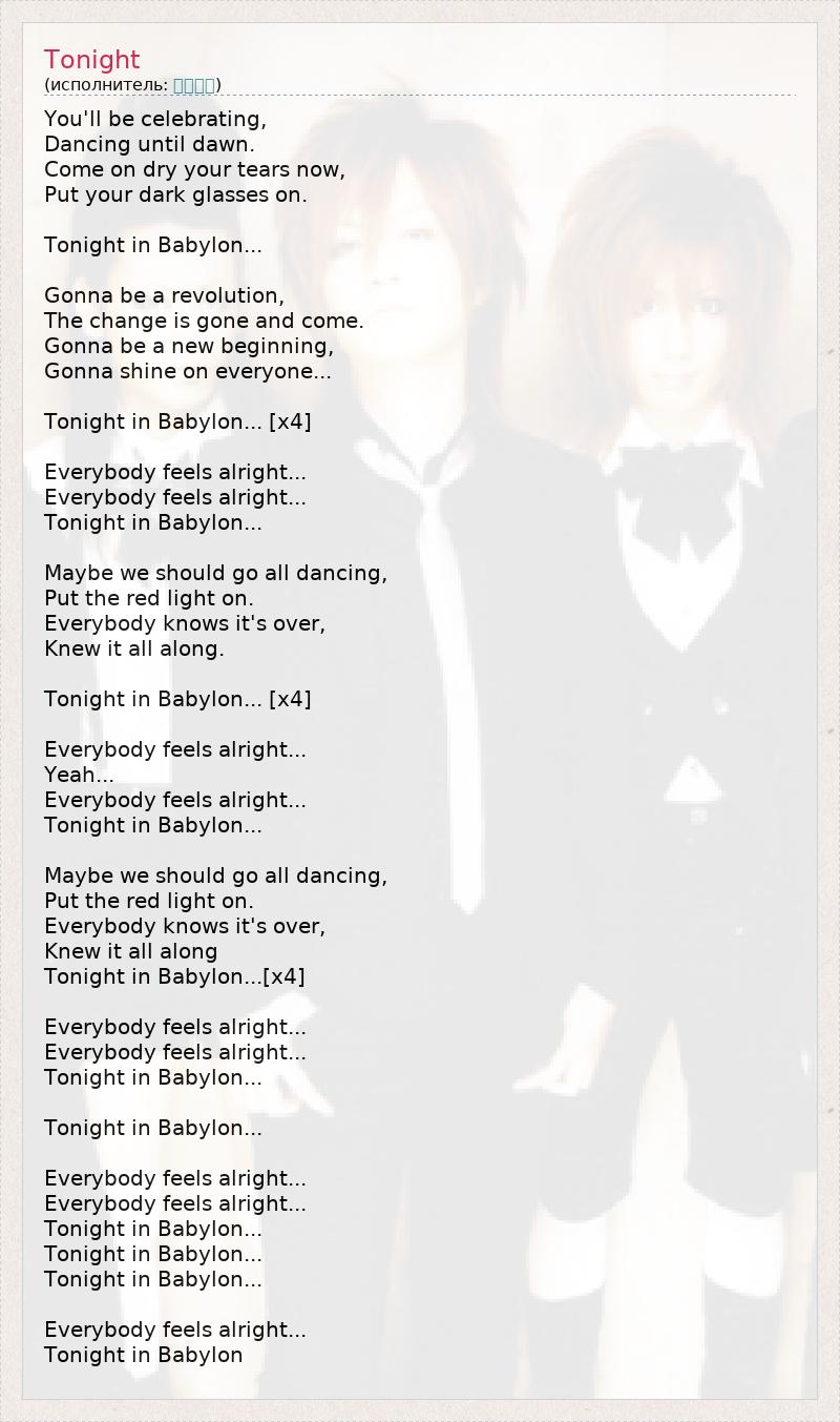 Ты будешь веселиться, Танцевать до рассвета. Ну же, вытри свои слёзы сейчас же, И надень солнечные очки. Сегодня ночью в Вавилоне... Собирается революция, Изменения пришли и ушли. Будет новое начало, Свет прольётся на каждого из нас... Сегодня ночью в Вавилоне... [x4] Всем хорошо, Всем хорошо Сегодня ночью в Вавилоне... Возможно, мы все должны танцевать, Включив красный свет. Все знают, что всё кончено, И всегда это знали... Сегодня ночью в Вавилоне... [x4] Всем хорошо, Да... Всем хорошо Сегодня ночью в Вавилоне... Возможно, мы все должны танцевать, Включив красный свет. Все знают, что всё кончено, И всегда это знали... Cегодня вечером в Вавилоне... [x4] Всем хорошо, Всем хорошо Сегодня ночью в Вавилоне... Сегодня ночью в Вавилоне... Всем хорошо, Всем хорошо Сегодня ночью в Вавилоне, Сегодня ночью в Вавилоне, Сегодня ночью в Вавилоне... Всем хорошо Сегодня ночью в Вавилоне.