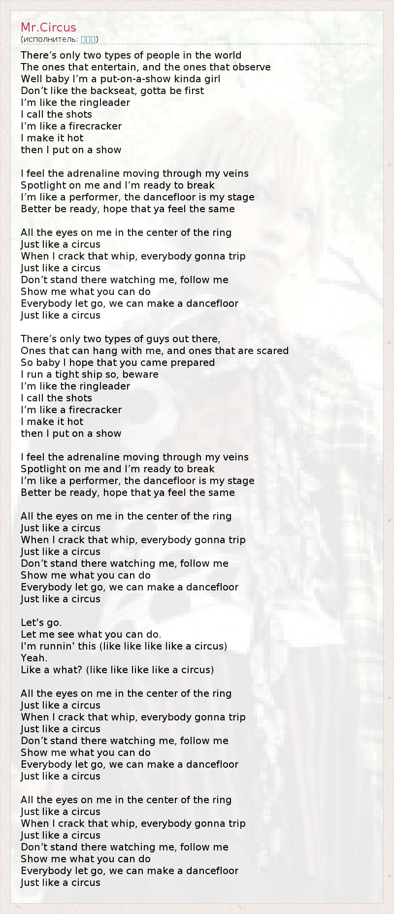 There’s only two types of people in the world The ones that entertain, and the ones that observe Well baby I’m a put-on-a-show kinda girl Don’t like the backseat, gotta be first I’m like the ringleader I call the shots I’m like a firecracker I make it hot then I put on a show I feel the adrenaline moving through my veins Spotlight on me and I’m ready to break I’m like a performer, the dancefloor is my stage Better be ready, hope that ya feel the same All the eyes on me in the center of the ring Just like a circus When I crack that whip, everybody gonna trip Just like a circus Don’t stand there watching me, follow me Show me what you can do Everybody let go, we can make a dancefloor Just like a circus There’s only two types of guys out there, Ones that can hang with me, and ones that are scared So baby I hope that you came prepared I run a tight ship so, beware I’m like the ringleader I call the shots I’m like a firecracker I make it hot then I put on a show I feel the adrenaline moving through my veins Spotlight on me and I’m ready to break I’m like a performer, the dancefloor is my stage Better be ready, hope that ya feel the same All the eyes on me in the center of the ring Just like a circus When I crack that whip, everybody gonna trip Just like a circus Don’t stand there watching me, follow me Show me what you can do Everybody let go, we can make a dancefloor Just like a circus Let's go. Let me see what you can do. I'm runnin' this (like like like like a circus) Yeah. Like a what? (like like like like a circus) All the eyes on me in the center of the ring Just like a circus When I crack that whip, everybody gonna trip Just like a circus Don’t stand there watching me, follow me Show me what you can do Everybody let go, we can make a dancefloor Just like a circus All the eyes on me in the center of the ring Just like a circus When I crack that whip, everybody gonna trip Just like a circus Don’t stand there watching me, follow me Show me what you can do Everybody let go, we can make a dancefloor Just like a circus