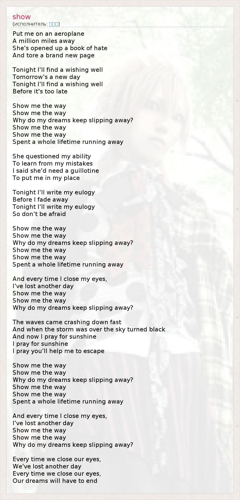 Put me on an aeroplane A million miles away She's opened up a book of hate And tore a brand new page Tonight I'll find a wishing well Tomorrow's a new day Tonight I'll find a wishing well Before it's too late Show me the way Show me the way Why do my dreams keep slipping away? Show me the way Show me the way Spent a whole lifetime running away She questioned my ability To learn from my mistakes I said she'd need a guillotine To put me in my place Tonight I'll write my eulogy Before I fade away Tonight I'll write my eulogy So don't be afraid Show me the way Show me the way Why do my dreams keep slipping away? Show me the way Show me the way Spent a whole lifetime running away And every time I close my eyes, I've lost another day Show me the way Show me the way Why do my dreams keep slipping away? The waves came crashing down fast And when the storm was over the sky turned black And now I pray for sunshine I pray for sunshine I pray you'll help me to escape Show me the way Show me the way Why do my dreams keep slipping away? Show me the way Show me the way Spent a whole lifetime running away And every time I close my eyes, I've lost another day Show me the way Show me the way Why do my dreams keep slipping away? Every time we close our eyes, We've lost another day Every time we close our eyes, Our dreams will have to end