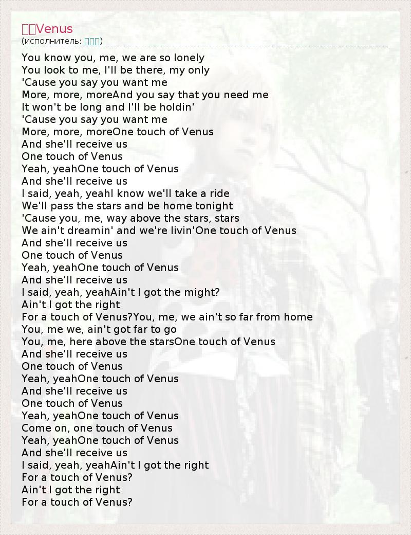 You know you, me, we are so lonely You look to me, I'll be there, my only 'Cause you say you want me More, more, moreAnd you say that you need me It won't be long and I'll be holdin' 'Cause you say you want me More, more, moreOne touch of Venus And she'll receive us One touch of Venus Yeah, yeahOne touch of Venus And she'll receive us I said, yeah, yeahI know we'll take a ride We'll pass the stars and be home tonight 'Cause you, me, way above the stars, stars We ain't dreamin' and we're livin'One touch of Venus And she'll receive us One touch of Venus Yeah, yeahOne touch of Venus And she'll receive us I said, yeah, yeahAin't I got the might? Ain't I got the right For a touch of Venus?You, me, we ain't so far from home You, me we, ain't got far to go You, me, here above the starsOne touch of Venus And she'll receive us One touch of Venus Yeah, yeahOne touch of Venus And she'll receive us One touch of Venus Yeah, yeahOne touch of Venus Come on, one touch of Venus Yeah, yeahOne touch of Venus And she'll receive us I said, yeah, yeahAin't I got the right For a touch of Venus? Ain't I got the right For a touch of Venus?