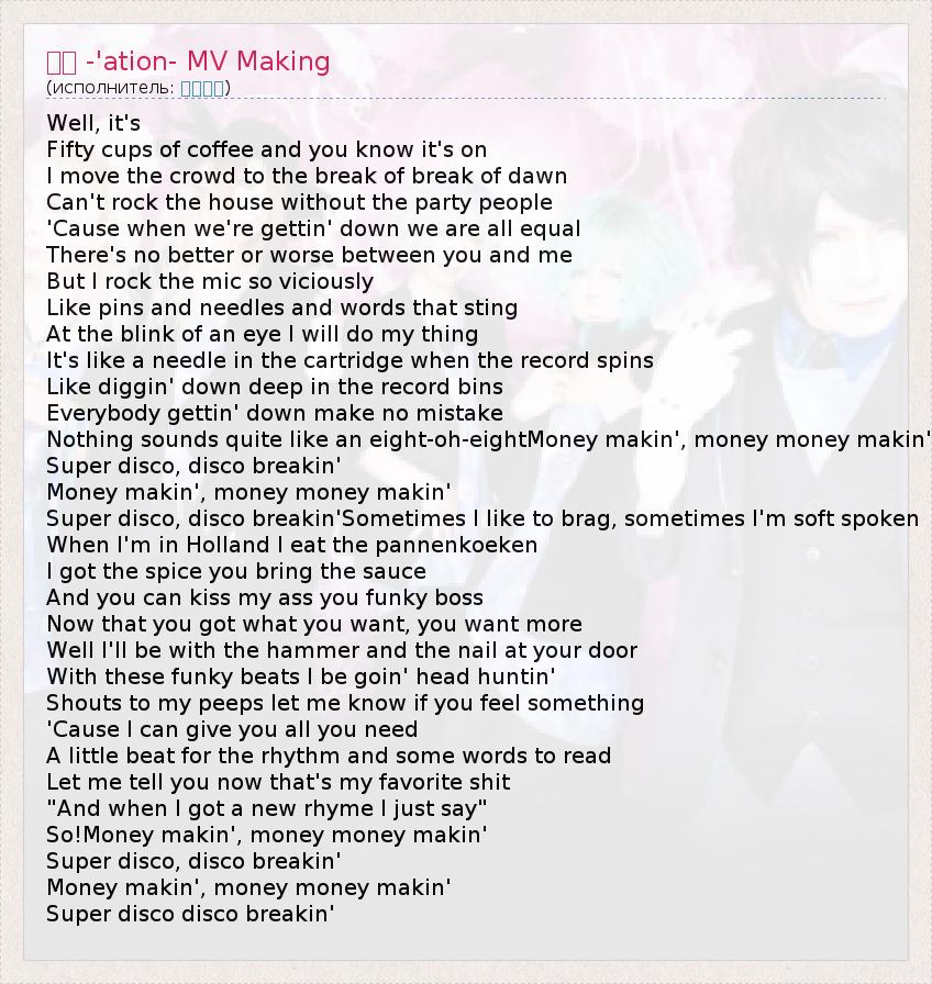 Well, it's Fifty cups of coffee and you know it's on I move the crowd to the break of break of dawn Can't rock the house without the party people 'Cause when we're gettin' down we are all equal There's no better or worse between you and me But I rock the mic so viciously Like pins and needles and words that sting At the blink of an eye I will do my thing It's like a needle in the cartridge when the record spins Like diggin' down deep in the record bins Everybody gettin' down make no mistake Nothing sounds quite like an eight-oh-eightMoney makin', money money makin' Super disco, disco breakin' Money makin', money money makin' Super disco, disco breakin'Sometimes I like to brag, sometimes I'm soft spoken When I'm in Holland I eat the pannenkoeken I got the spice you bring the sauce And you can kiss my ass you funky boss Now that you got what you want, you want more Well I'll be with the hammer and the nail at your door With these funky beats I be goin' head huntin' Shouts to my peeps let me know if you feel something 'Cause I can give you all you need A little beat for the rhythm and some words to read Let me tell you now that's my favorite shit "And when I got a new rhyme I just say" So!Money makin', money money makin' Super disco, disco breakin' Money makin', money money makin' Super disco disco breakin'