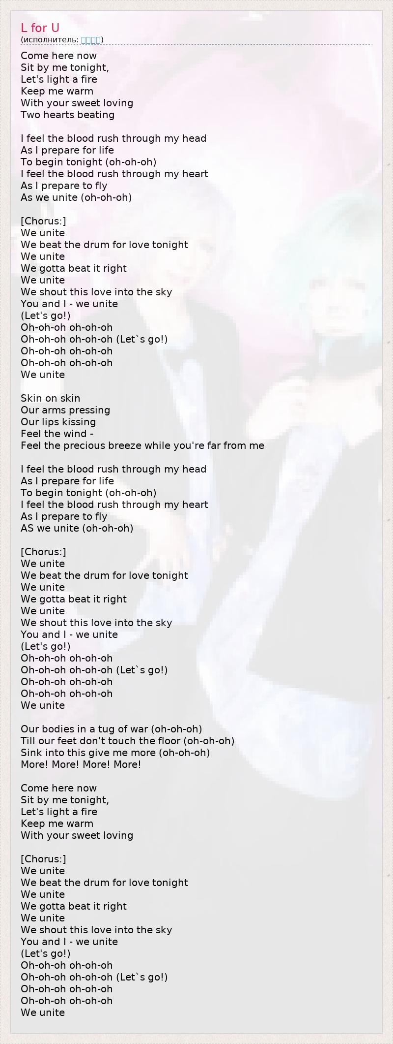 Come here now Sit by me tonight, Let's light a fire Keep me warm With your sweet loving Two hearts beating I feel the blood rush through my head As I prepare for life To begin tonight (oh-oh-oh) I feel the blood rush through my heart As I prepare to fly As we unite (oh-oh-oh) [Chorus:] We unite We beat the drum for love tonight We unite We gotta beat it right We unite We shout this love into the sky You and I - we unite (Let's go!) Oh-oh-oh oh-oh-oh Oh-oh-oh oh-oh-oh (Let`s go!) Oh-oh-oh oh-oh-oh Oh-oh-oh oh-oh-oh We unite Skin on skin Our arms pressing Our lips kissing Feel the wind - Feel the precious breeze while you're far from me I feel the blood rush through my head As I prepare for life To begin tonight (oh-oh-oh) I feel the blood rush through my heart As I prepare to fly AS we unite (oh-oh-oh) [Chorus:] We unite We beat the drum for love tonight We unite We gotta beat it right We unite We shout this love into the sky You and I - we unite (Let's go!) Oh-oh-oh oh-oh-oh Oh-oh-oh oh-oh-oh (Let`s go!) Oh-oh-oh oh-oh-oh Oh-oh-oh oh-oh-oh We unite Our bodies in a tug of war (oh-oh-oh) Till our feet don't touch the floor (oh-oh-oh) Sink into this give me more (oh-oh-oh) More! More! More! More! Come here now Sit by me tonight, Let's light a fire Keep me warm With your sweet loving [Chorus:] We unite We beat the drum for love tonight We unite We gotta beat it right We unite We shout this love into the sky You and I - we unite (Let's go!) Oh-oh-oh oh-oh-oh Oh-oh-oh oh-oh-oh (Let`s go!) Oh-oh-oh oh-oh-oh Oh-oh-oh oh-oh-oh We unite