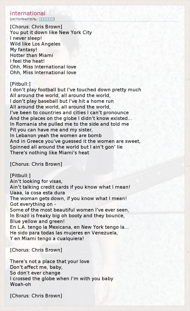 [Припев: Chris Brown] С тобой я словно в Нью-Йорке – Никогда не сплю! Ты потрясающая, как Лос-Анджелес – Моя фантазия! Горячее, чем Майами, Я чувствую эту жару! Оо, Мисс Международная любовь, Оо, Мисс Международная любовь [Pitbull:] Моя нога не касается мяча, но ступала много где По всему миру, по всему миру, Не играю в бейсбол, но добился успеха 1 Во всем мире, во всем мире, Я был в городах и странах, чьи названия не выговорить, И тех местах, о существовании которых даже не знал... В Румынии одна утянула меня в сторонку и сказала, мол, Пит, можешь получить меня и мою сестру, В Ливане, даа, женщины просто бомбы, А в Греции, ну вам и так понятно, женщины конфетки, Я объехал весь свет, но не буду лгать – Нет ничего похожего на жару Майами [Припев: Chris Brown] [Pitbull:] И не нужны ни визы, Ни кредитки, если понимаешь, о чем я! Ааа, ну и положеньице, И вот она уже "подбила" тебя, если понимаешь, о чем я! Всё при них – Одни из красивейших женщин, что я видел, В Бразилии – сумасбродки с попками, как мячики, Разных цветов! 2 В Лос-Анджелесе у меня мексиканка, в Нью-Йорке - .... Был со всеми женщинами в Венесуэле, И в Майами получаю любую! [Припев: Chris Brown] Нет такого места, где бы твоя любовь Не коснулась меня, детка, Так не меняйся же никогда, Когда я с тобой – я словно был везде, Уоу – оо [Припев: Chris Brown] 1 - to hit a home run - сделать хоумран, результативный удар, в переносном значении – добиться успеха 2 - сленг: blue – боязливые (либо – навеселе), yellow – робкие, green – цветущие, полные сил