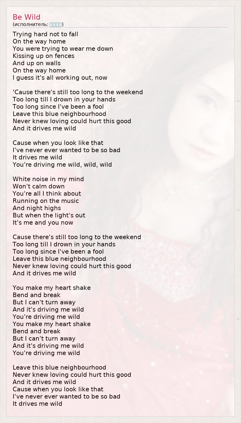 Trying hard not to fall On the way home You were trying to wear me down Kissing up on fences And up on walls On the way home I guess it's all working out, now ‘Cause there's still too long to the weekend Too long till I drown in your hands Too long since I've been a fool Leave this blue neighbourhood Never knew loving could hurt this good And it drives me wild Cause when you look like that I've never ever wanted to be so bad It drives me wild You're driving me wild, wild, wild White noise in my mind Won't calm down You're all I think about Running on the music And night highs But when the light's out It's me and you now Cause there's still too long to the weekend Too long till I drown in your hands Too long since I've been a fool Leave this blue neighbourhood Never knew loving could hurt this good And it drives me wild You make my heart shake Bend and break But I can't turn away And it's driving me wild You're driving me wild You make my heart shake Bend and break But I can't turn away And it's driving me wild You're driving me wild Leave this blue neighbourhood Never knew loving could hurt this good And it drives me wild Cause when you look like that I've never ever wanted to be so bad It drives me wild