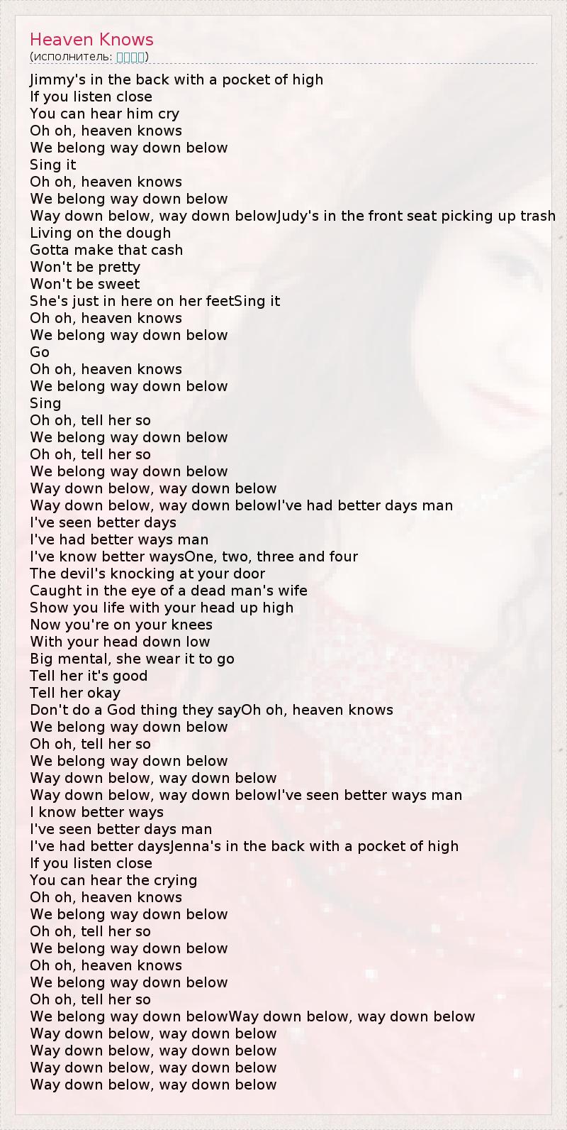 Jimmy's in the back with a pocket of high If you listen close You can hear him cry Oh oh, heaven knows We belong way down below Sing it Oh oh, heaven knows We belong way down below Way down below, way down belowJudy's in the front seat picking up trash Living on the dough Gotta make that cash Won't be pretty Won't be sweet She's just in here on her feetSing it Oh oh, heaven knows We belong way down below Go Oh oh, heaven knows We belong way down below Sing Oh oh, tell her so We belong way down below Oh oh, tell her so We belong way down below Way down below, way down below Way down below, way down belowI've had better days man I've seen better days I've had better ways man I've know better waysOne, two, three and four The devil's knocking at your door Caught in the eye of a dead man's wife Show you life with your head up high Now you're on your knees With your head down low Big mental, she wear it to go Tell her it's good Tell her okay Don't do a God thing they sayOh oh, heaven knows We belong way down below Oh oh, tell her so We belong way down below Way down below, way down below Way down below, way down belowI've seen better ways man I know better ways I've seen better days man I've had better daysJenna's in the back with a pocket of high If you listen close You can hear the crying Oh oh, heaven knows We belong way down below Oh oh, tell her so We belong way down below Oh oh, heaven knows We belong way down below Oh oh, tell her so We belong way down belowWay down below, way down below Way down below, way down below Way down below, way down below Way down below, way down below Way down below, way down below