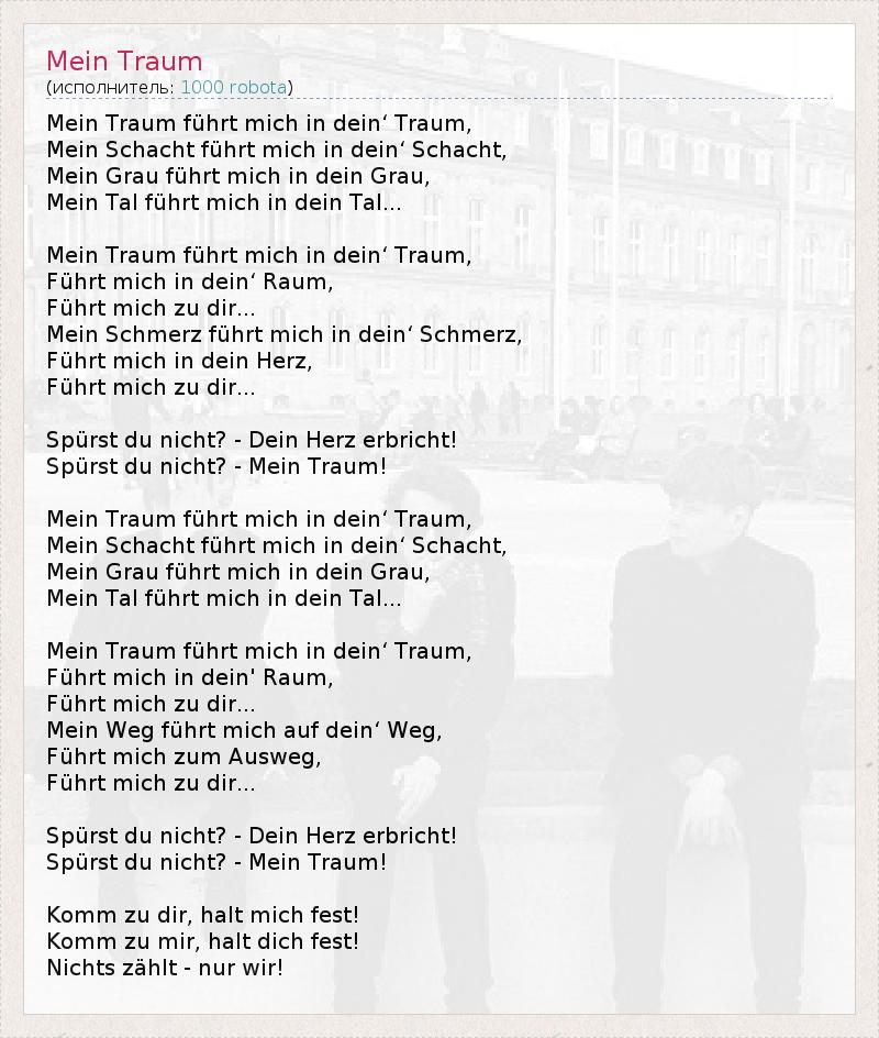 Мой сон уводит меня в твои сновидения, Моя шахта выводит меня в твою шахту, Моя заурядность 1 сталкивает меня с твоей заурядностью, Моя долина приводит меня в твою долину... Мой сон уводит меня в твои сновидения, Уносит меня в твое пространство, Ведет меня к тебе... Мое страдание ведет меня к твоей боли, Приводит меня в твое сердце, Приводит меня к тебе... Разве ты не чувствуешь? В твое сердце проникают! 2 Разве ты не чувствуешь? Мой сон! Мой сон уводит меня в твои сновидения, Моя шахта выводит меня в твою шахту, Моя заурядность сталкивает меня с твоей заурядностью, Моя долина приводит меня в твою долину... Мой сон уводит меня в твои сновидения, Уносит меня в твое пространство, Ведет меня к тебе... Мой путь пересекается с твоей дорогой, Ведет меня к выходу, Ведет к тебе... Разве ты не чувствуешь? В твое сердце проникают! Разве ты не чувствуешь? Мой сон! Я иду к тебе, крепко держи меня! Приди ко мне, я крепко держу тебя! Значимы лишь только мы! 1 - Grau – досл. серый цвет, серость 2 - erbrechen – досл. взламывать, вскрывать