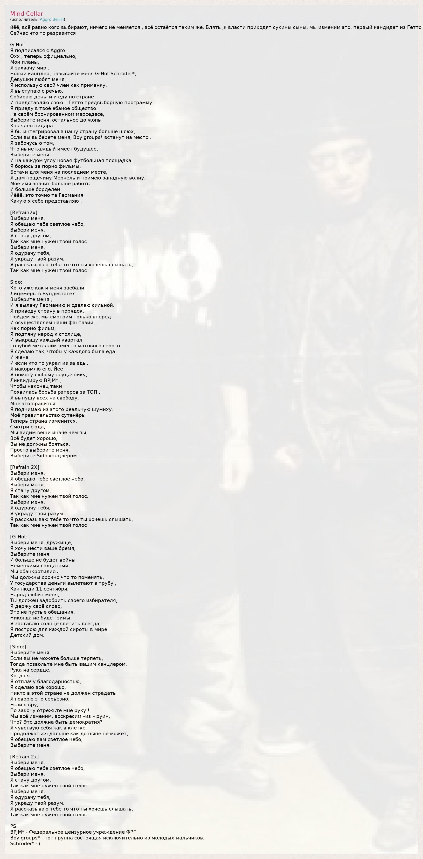 йёё, всё равно кого выбирают, ничего не меняется , всё остаётся таким же. Блять ,к власти приходят сукины сыны, мы изменим это, первый кандидат из Гетто Сейчас что то разразится G-Hot: Я подписался с Aggro , Охх , теперь официально, Мои планы, Я захвачу мир . Новый канцлер, называйте меня G-Hot Schröder*, Девушки любят меня, Я использую свой член как приманку. Я выступаю с речью, Собираю деньги и еду по стране И представляю свою – Гетто предвыборную программу. Я приеду в твоё ебаное общество На своём бронированном мерседесе, Выберите меня, остальное до жопы Как член пидара. Я бы интегрировал в нашу страну больше шлюх, Если вы выберете меня, Boy groups* встанут на место . Я забочусь о том, Что ныне каждый имеет будущее, Выберите меня И на каждом углу новая футбольная площадка, Я борюсь за порно фильмы, Богачи для меня на последнем месте, Я дам пощёчину Меркель и поимею западную волну. Моё имя значит больше работы И больше борделей Йёёё, это точно та Германия Какую я себе представляю . [Refrain2x] Выбери меня, Я обещаю тебе светлое небо, Выбери меня, Я стану другом, Так как мне нужен твой голос. Выбери меня, Я одурачу тебя, Я украду твой разум. Я рассказываю тебе то что ты хочешь слышать, Так как мне нужен твой голос Sido: Кого уже как и меня заебали Лицемеры в Бундестаге? Выберите меня , И я вылечу Германию и сделаю сильной. Я приведу страну в порядок, Пойдём же, мы смотрим только вперёд И осуществляем наши фантазии, Как порно фильм, Я подтяну народ к столице, И выкрашу каждый квартал Голубой металлик вместо матового серого. Я сделаю так, чтобы у каждого была еда И жена И если кто то украл из за еды, Я накормлю его. Йёё Я помогу любому неудачнику, Ликвидирую BPjM* , Чтобы наконец таки Появилась борьба рэперов за ТОП .. Я выпущу всех на свободу. Мне это нравится Я поднимаю из этого реальную шумиху. Моё правительство сутенёры Теперь страна изменится. Смотри сюда, Мы видим вещи иначе чем вы, Всё будет хорошо, Вы не должны бояться, Просто выберите меня, Выберите Sido канцлером ! [Refrain 2X] Выбери меня, Я обещаю тебе светлое небо, Выбери меня, Я стану другом, Так как мне нужен твой голос. Выбери меня, Я одурачу тебя, Я украду твой разум. Я рассказываю тебе то что ты хочешь слышать, Так как мне нужен твой голос [G-Hot:] Выбери меня, дружище, Я хочу нести ваше бремя, Выберите меня И больше не будет войны Немецкими солдатами, Мы обанкротились, Мы должны срочно что то поменять, У государства деньги вылетают в трубу , Как люди 11 сентября, Народ любит меня, Ты должен задобрить своего избирателя, Я держу своё слово, Это не пустые обещания. Никогда не будет зимы, Я заставлю солнце светить всегда, Я построю для каждой сироты в мире Детский дом. [Sido:] Выберите меня, Если вы не можете больше терпеть, Тогда позвольте мне быть вашим канцлером. Рука на сердце, Когда я …., Я отплачу благодарностью, Я сделаю всё хорошо, Никто в этой стране не должен страдать Я говорю это серьёзно, Если я вру, По закону отрежьте мне руку ! Мы всё изменим, воскресим –из – руин, Что? Это должна быть демократия? Я чувствую себя как в клетке. Продолжаться дальше как до ныне не может, Я обещаю вам светлое небо, Выберите меня. [Refrain 2x] Выбери меня, Я обещаю тебе светлое небо, Выбери меня, Я стану другом, Так как мне нужен твой голос. Выбери меня, Я одурачу тебя, Я украду твой разум. Я рассказываю тебе то что ты хочешь слышать, Так как мне нужен твой голос PS. BPjM* - Федеральн