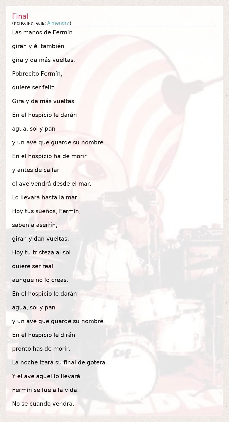 Las manos de Fermín giran y él también gira y da más vueltas. Pobrecito Fermín, quiere ser feliz. Gira y da más vueltas. En el hospicio le darán agua, sol y pan y un ave que guarde su nombre. En el hospicio ha de morir y antes de callar el ave vendrá desde el mar. Lo llevará hasta la mar. Hoy tus sueños, Fermín, saben a aserrín, giran y dan vueltas. Hoy tu tristeza al sol quiere ser real aunque no lo creas. En el hospicio le darán agua, sol y pan y un ave que guarde su nombre. En el hospicio le dirán pronto has de morir. La noche izará su final de gotera. Y el ave aquel lo llevará. Fermín se fue a la vida. No se cuando vendrá.