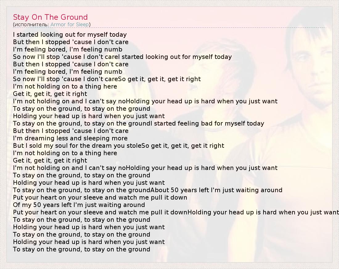 I started looking out for myself today But then I stopped 'cause I don't care I'm feeling bored, I'm feeling numb So now I'll stop 'cause I don't careI started looking out for myself today But then I stopped 'cause I don't care I'm feeling bored, I'm feeling numb So now I'll stop 'cause I don't careSo get it, get it, get it right I'm not holding on to a thing here Get it, get it, get it right I'm not holding on and I can't say noHolding your head up is hard when you just want To stay on the ground, to stay on the ground Holding your head up is hard when you just want To stay on the ground, to stay on the groundI started feeling bad for myself today But then I stopped 'cause I don't care I'm dreaming less and sleeping more But I sold my soul for the dream you stoleSo get it, get it, get it right I'm not holding on to a thing here Get it, get it, get it right I'm not holding on and I can't say noHolding your head up is hard when you just want To stay on the ground, to stay on the ground Holding your head up is hard when you just want To stay on the ground, to stay on the groundAbout 50 years left I'm just waiting around Put your heart on your sleeve and watch me pull it down Of my 50 years left I'm just waiting around Put your heart on your sleeve and watch me pull it downHolding your head up is hard when you just want To stay on the ground, to stay on the ground Holding your head up is hard when you just want To stay on the ground, to stay on the ground Holding your head up is hard when you just want To stay on the ground, to stay on the ground