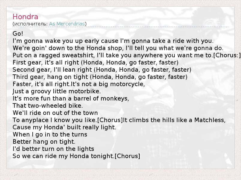 First gear, it's all right (Honda, Honda, go faster, faster)