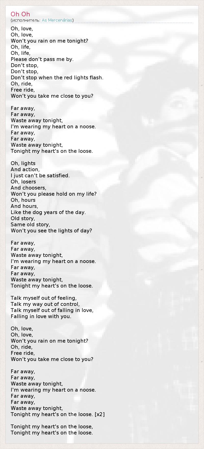 Oh, love, Oh, love, Won't you rain on me tonight? Oh, life, Oh, life, Please don't pass me by. Don't stop, Don't stop, Don't stop when the red lights flash. Oh, ride, Free ride, Won't you take me close to you? Far away, Far away, Waste away tonight, I'm wearing my heart on a noose. Far away, Far away, Waste away tonight, Tonight my heart's on the loose. Oh, lights And action, I just can't be satisfied. Oh, losers And choosers, Won't you please hold on my life? Oh, hours And hours, Like the dog years of the day. Old story, Same old story, Won't you see the lights of day? Far away, Far away, Waste away tonight, I'm wearing my heart on a noose. Far away, Far away, Waste away tonight, Tonight my heart's on the loose. Talk myself out of feeling, Talk my way out of control, Talk myself out of falling in love, Falling in love with you. Oh, love, Oh, love, Won't you rain on me tonight? Oh, ride, Free ride, Won't you take me close to you? Far away, Far away, Waste away tonight, I'm wearing my heart on a noose. Far away, Far away, Waste away tonight, Tonight my heart's on the loose. [x2] Tonight my heart's on the loose, Tonight my heart's on the loose.