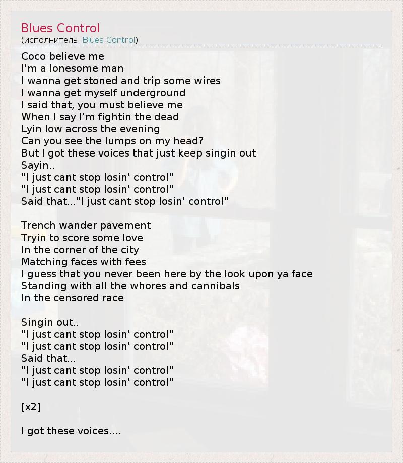Coco believe me I'm a lonesome man I wanna get stoned and trip some wires I wanna get myself underground I said that, you must believe me When I say I'm fightin the dead Lyin low across the evening Can you see the lumps on my head? But I got these voices that just keep singin out Sayin.. "I just cant stop losin' control" "I just cant stop losin' control" Said that..."I just cant stop losin' control" Trench wander pavement Tryin to score some love In the corner of the city Matching faces with fees I guess that you never been here by the look upon ya face Standing with all the whores and cannibals In the censored race Singin out.. "I just cant stop losin' control" "I just cant stop losin' control" Said that... "I just cant stop losin' control" "I just cant stop losin' control" [x2] I got these voices....