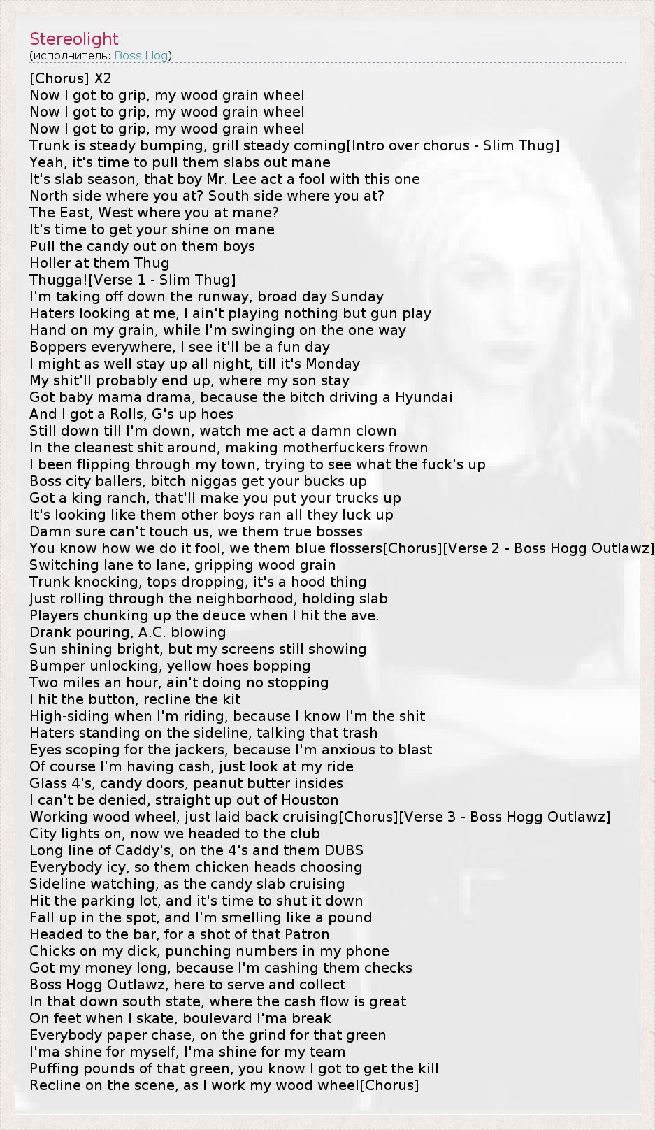 [Chorus] X2 Now I got to grip, my wood grain wheel Now I got to grip, my wood grain wheel Now I got to grip, my wood grain wheel Trunk is steady bumping, grill steady coming[Intro over chorus - Slim Thug] Yeah, it's time to pull them slabs out mane It's slab season, that boy Mr. Lee act a fool with this one North side where you at? South side where you at? The East, West where you at mane? It's time to get your shine on mane Pull the candy out on them boys Holler at them Thug Thugga![Verse 1 - Slim Thug] I'm taking off down the runway, broad day Sunday Haters looking at me, I ain't playing nothing but gun play Hand on my grain, while I'm swinging on the one way Boppers everywhere, I see it'll be a fun day I might as well stay up all night, till it's Monday My shit'll probably end up, where my son stay Got baby mama drama, because the bitch driving a Hyundai And I got a Rolls, G's up hoes Still down till I'm down, watch me act a damn clown In the cleanest shit around, making motherfuckers frown I been flipping through my town, trying to see what the fuck's up Boss city ballers, bitch niggas get your bucks up Got a king ranch, that'll make you put your trucks up It's looking like them other boys ran all they luck up Damn sure can't touch us, we them true bosses You know how we do it fool, we them blue flossers[Chorus][Verse 2 - Boss Hogg Outlawz] Switching lane to lane, gripping wood grain Trunk knocking, tops dropping, it's a hood thing Just rolling through the neighborhood, holding slab Players chunking up the deuce when I hit the ave. Drank pouring, A.C. blowing Sun shining bright, but my screens still showing Bumper unlocking, yellow hoes bopping Two miles an hour, ain't doing no stopping I hit the button, recline the kit High-siding when I'm riding, because I know I'm the shit Haters standing on the sideline, talking that trash Eyes scoping for the jackers, because I'm anxious to blast Of course I'm having cash, just look at my ride Glass 4's, candy doors, peanut butter insides I can't be denied, straight up out of Houston Working wood wheel, just laid back cruising[Chorus][Verse 3 - Boss Hogg Outlawz] City lights on, now we headed to the club Long line of Caddy's, on the 4's and them DUBS Everybody icy, so them chicken heads choosing Sideline watching, as the candy slab cruising Hit the parking lot, and it's time to shut it down Fall up in the spot, and I'm smelling like a pound Headed to the bar, for a shot of that Patron Chicks on my dick, punching numbers in my phone Got my money long, because I'm cashing them checks Boss Hogg Outlawz, here to serve and collect In that down south state, where the cash flow is great On feet when I skate, boulevard I'ma break Everybody paper chase, on the grind for that green I'ma shine for myself, I'ma shine for my team Puffing pounds of that green, you know I got to get the kill Recline on the scene, as I work my wood wheel[Chorus]