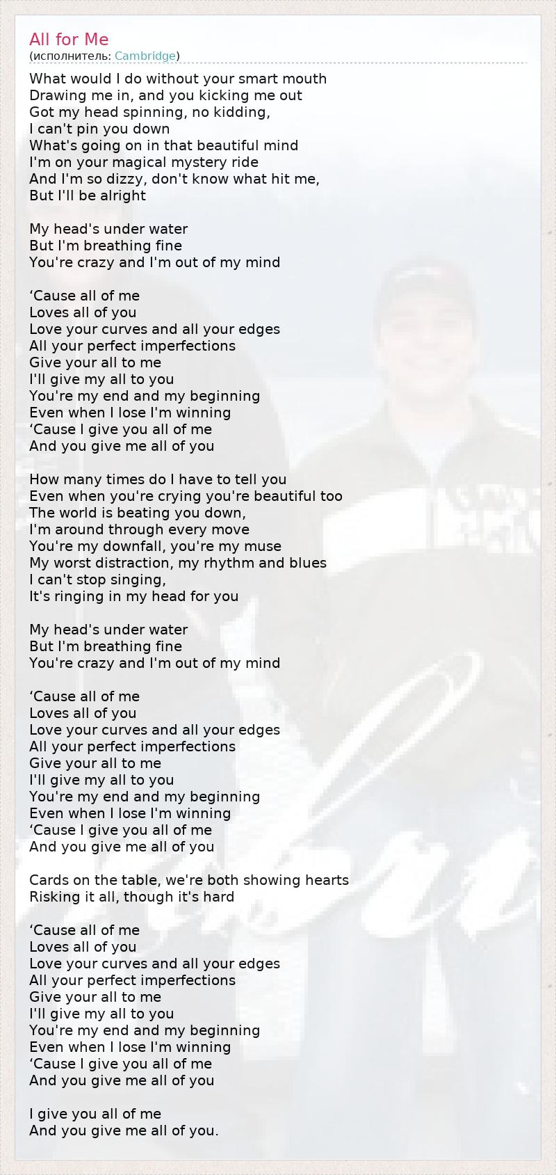 What would I do without your smart mouth Drawing me in, and you kicking me out Got my head spinning, no kidding, I can't pin you down What's going on in that beautiful mind I'm on your magical mystery ride And I'm so dizzy, don't know what hit me, But I'll be alright My head's under water But I'm breathing fine You're crazy and I'm out of my mind ‘Cause all of me Loves all of you Love your curves and all your edges All your perfect imperfections Give your all to me I'll give my all to you You're my end and my beginning Even when I lose I'm winning ‘Cause I give you all of me And you give me all of you How many times do I have to tell you Even when you're crying you're beautiful too The world is beating you down, I'm around through every move You're my downfall, you're my muse My worst distraction, my rhythm and blues I can't stop singing, It's ringing in my head for you My head's under water But I'm breathing fine You're crazy and I'm out of my mind ‘Cause all of me Loves all of you Love your curves and all your edges All your perfect imperfections Give your all to me I'll give my all to you You're my end and my beginning Even when I lose I'm winning ‘Cause I give you all of me And you give me all of you Cards on the table, we're both showing hearts Risking it all, though it's hard ‘Cause all of me Loves all of you Love your curves and all your edges All your perfect imperfections Give your all to me I'll give my all to you You're my end and my beginning Even when I lose I'm winning ‘Cause I give you all of me And you give me all of you I give you all of me And you give me all of you.