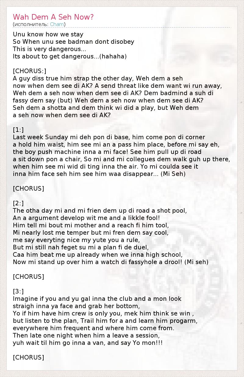 Unu know how we stay So When unu see badman dont disobey This is very dangerous... Its about to get dangerous...(hahaha) [CHORUS:] A guy diss true him strap the other day, Weh dem a seh now when dem see di AK? A send threat like dem want wi run away, Weh dem a seh now when dem see di AK? Dem badmind a suh di fassy dem say (but) Weh dem a seh now when dem see di AK? Seh dem a shotta and dem think wi did a play, but Weh dem a seh now when dem see di AK? [1:] Last week Sunday mi deh pon di base, him come pon di corner a hold him waist, him see mi an a pass him place, before mi say eh, the boy push machine inna a mi face! See him pull up di road a sit down pon a chair, So mi and mi collegues dem walk guh up there, when him see mi wid di ting inna the air. Yo mi coulda see it inna him face seh him see him waa disappear... (Mi Seh) [CHORUS] [2:] The otha day mi and mi frien dem up di road a shot pool, An a argument develop wit me and a likkle fool! Him tell mi bout mi mother and a reach fi him tool, Mi nearly lost me temper but mi fren dem say cool, me say everyting nice my yute you a rule, But mi still nah feget su mi a plan fi de duel, Caa him beat me up already when we inna high school, Now mi stand up over him a watch di fassyhole a drool! (Mi seh) [CHORUS] [3:] Imagine if you and yu gal inna the club and a mon look straigh inna ya face and grab her bottom, Yo if him have him crew is only you, mek him think se win , but listen to the plan, Trail him for a and learn him progarm, everywhere him frequent and where him come from. Then late one night when him a leave a session, yuh wait til him go inna a van, and say Yo mon!!! [CHORUS]