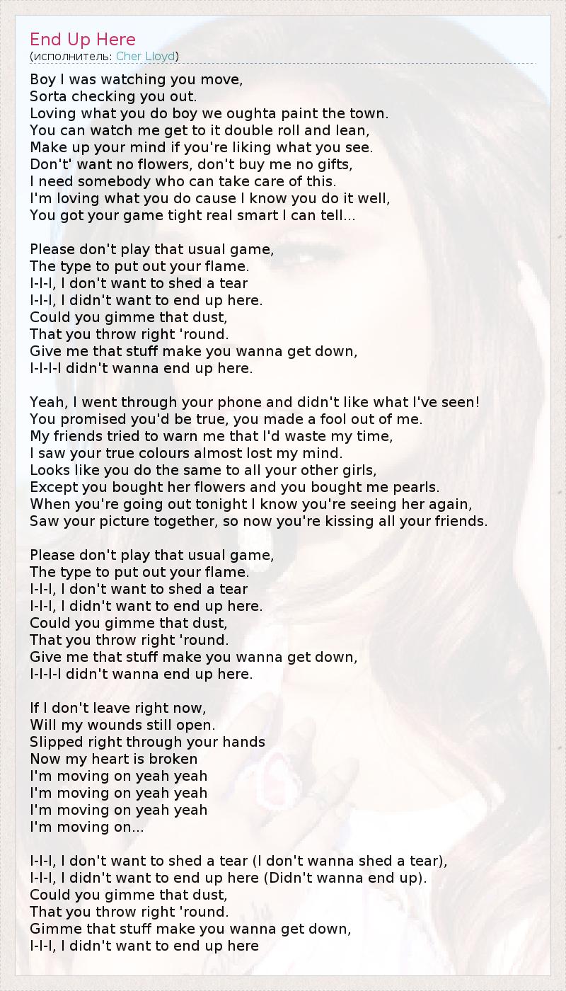 Boy I was watching you move, Sorta checking you out. Loving what you do boy we oughta paint the town. You can watch me get to it double roll and lean, Make up your mind if you're liking what you see. Don't' want no flowers, don't buy me no gifts, I need somebody who can take care of this. I'm loving what you do cause I know you do it well, You got your game tight real smart I can tell... Please don't play that usual game, The type to put out your flame. I-I-I, I don't want to shed a tear I-I-I, I didn't want to end up here. Could you gimme that dust, That you throw right 'round. Give me that stuff make you wanna get down, I-I-I-I didn't wanna end up here. Yeah, I went through your phone and didn't like what I've seen! You promised you'd be true, you made a fool out of me. My friends tried to warn me that I'd waste my time, I saw your true colours almost lost my mind. Looks like you do the same to all your other girls, Except you bought her flowers and you bought me pearls. When you're going out tonight I know you're seeing her again, Saw your picture together, so now you're kissing all your friends. Please don't play that usual game, The type to put out your flame. I-I-I, I don't want to shed a tear I-I-I, I didn't want to end up here. Could you gimme that dust, That you throw right 'round. Give me that stuff make you wanna get down, I-I-I-I didn't wanna end up here. If I don't leave right now, Will my wounds still open. Slipped right through your hands Now my heart is broken I'm moving on yeah yeah I'm moving on yeah yeah I'm moving on yeah yeah I'm moving on... I-I-I, I don't want to shed a tear (I don't wanna shed a tear), I-I-I, I didn't want to end up here (Didn't wanna end up). Could you gimme that dust, That you throw right 'round. Gimme that stuff make you wanna get down, I-I-I, I didn't want to end up here