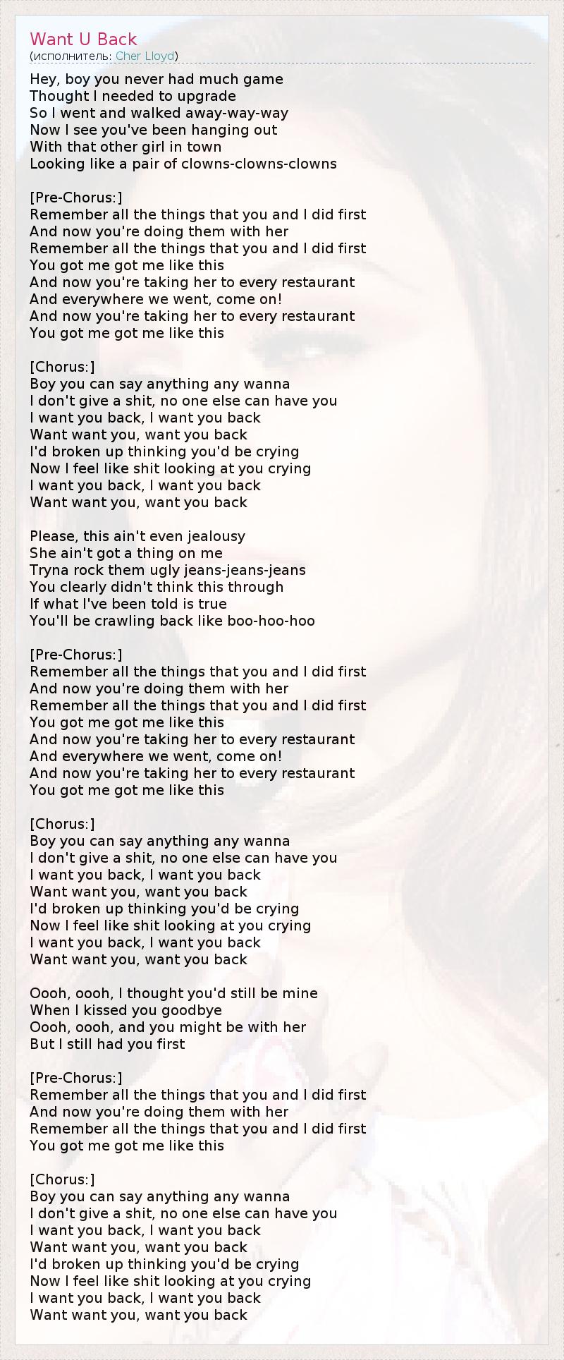 Hey, boy you never had much game Thought I needed to upgrade So I went and walked away-way-way Now I see you've been hanging out With that other girl in town Looking like a pair of clowns-clowns-clowns [Pre-Chorus:] Remember all the things that you and I did first And now you're doing them with her Remember all the things that you and I did first You got me got me like this And now you're taking her to every restaurant And everywhere we went, come on! And now you're taking her to every restaurant You got me got me like this [Chorus:] Boy you can say anything any wanna I don't give a shit, no one else can have you I want you back, I want you back Want want you, want you back I'd broken up thinking you'd be crying Now I feel like shit looking at you crying I want you back, I want you back Want want you, want you back Please, this ain't even jealousy She ain't got a thing on me Tryna rock them ugly jeans-jeans-jeans You clearly didn't think this through If what I've been told is true You'll be crawling back like boo-hoo-hoo [Pre-Chorus:] Remember all the things that you and I did first And now you're doing them with her Remember all the things that you and I did first You got me got me like this And now you're taking her to every restaurant And everywhere we went, come on! And now you're taking her to every restaurant You got me got me like this [Chorus:] Boy you can say anything any wanna I don't give a shit, no one else can have you I want you back, I want you back Want want you, want you back I'd broken up thinking you'd be crying Now I feel like shit looking at you crying I want you back, I want you back Want want you, want you back Oooh, oooh, I thought you'd still be mine When I kissed you goodbye Oooh, oooh, and you might be with her But I still had you first [Pre-Chorus:] Remember all the things that you and I did first And now you're doing them with her Remember all the things that you and I did first You got me got me like this [Chorus:] Boy you can say anything any wanna I don't give a shit, no one else can have you I want you back, I want you back Want want you, want you back I'd broken up thinking you'd be crying Now I feel like shit looking at you crying I want you back, I want you back Want want you, want you back