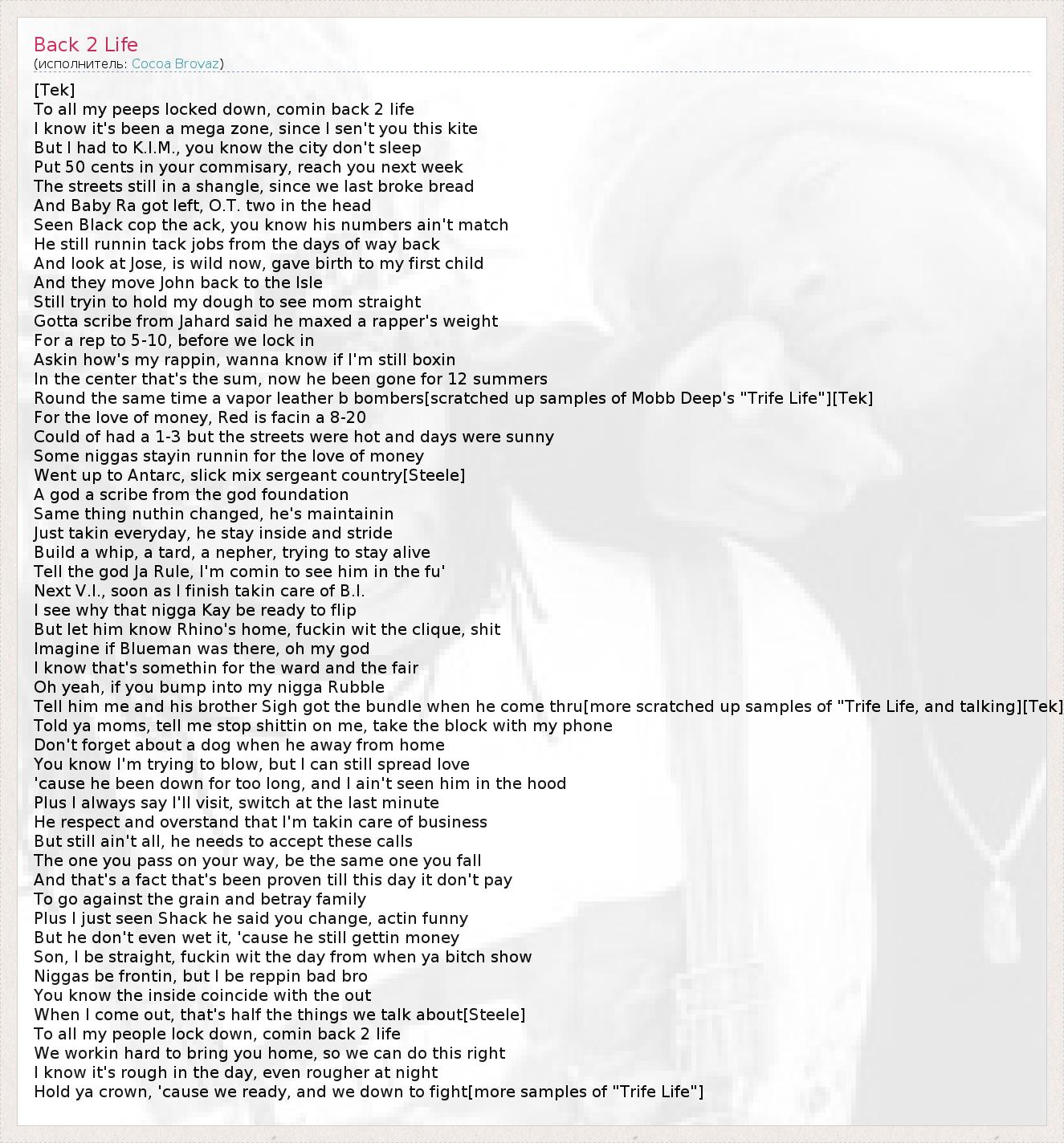 Это интересно:Cocoa Brovaz (aka Smif-n-Wessun ) - дуэт бруклинских MC - TEK и Steele, вошедших позже вместе с Buckshot, Heltah Skeltah и Originoo Gunn Clappaz в состав супергруппы Boot Camp Click.Дебютировали в 1993 на альбоме Black Moon «Enta da Stage» на трэках «Black Smif-n-Wessun» и «U Da Man». В 1994 выпустили сингл «Bucktown», получивший признание underground-общественности. Это дало толчок к выходу в январе 1995 года альбома «Dah Shinin», который дебютировал в пятёрке Top R&B/Hip-Hop Albums.... продолжение