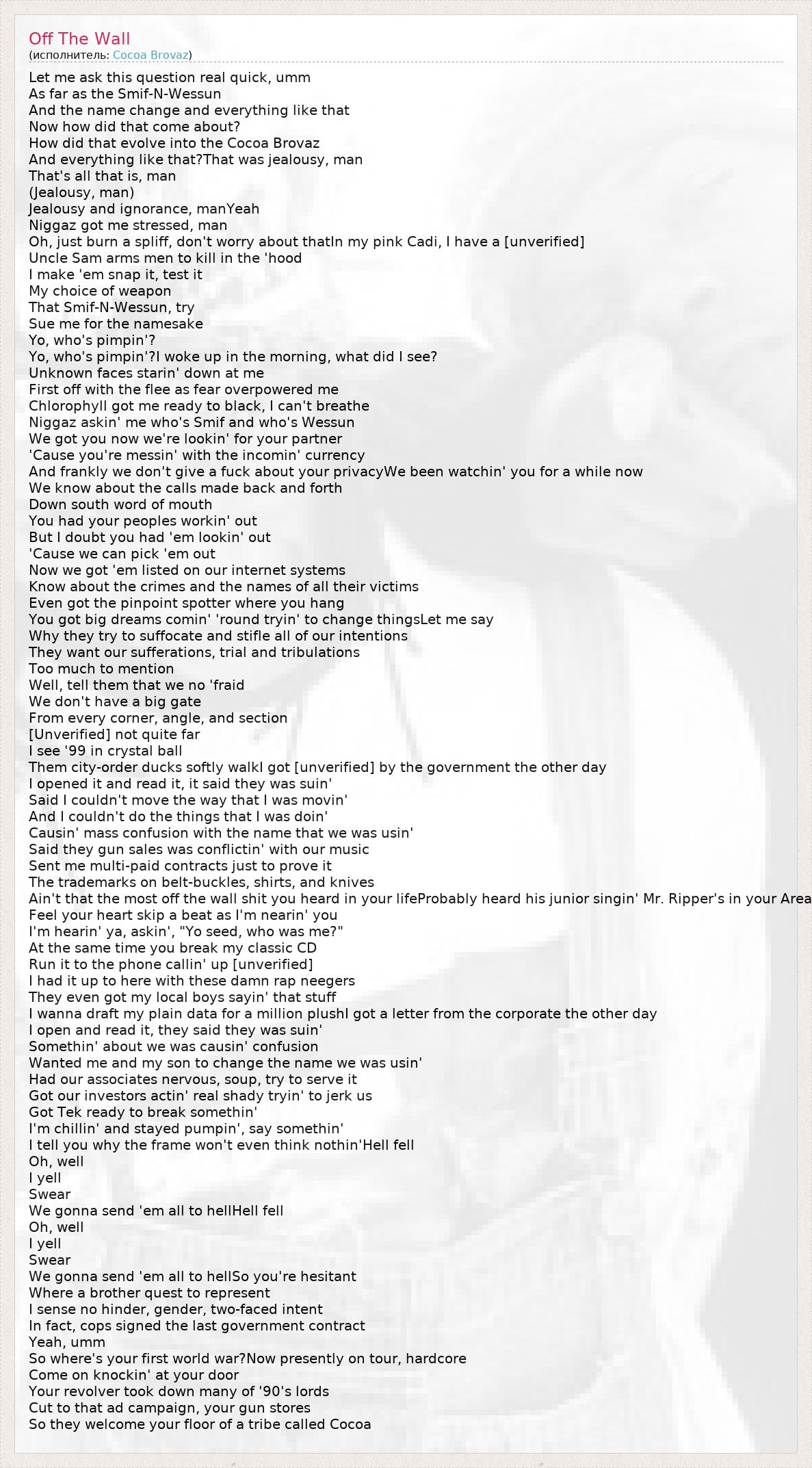 Let me ask this question real quick, umm As far as the Smif-N-Wessun And the name change and everything like that Now how did that come about? How did that evolve into the Cocoa Brovaz And everything like that?That was jealousy, man That's all that is, man (Jealousy, man) Jealousy and ignorance, manYeah Niggaz got me stressed, man Oh, just burn a spliff, don't worry about thatIn my pink Cadi, I have a [unverified] Uncle Sam arms men to kill in the 'hood I make 'em snap it, test it My choice of weapon That Smif-N-Wessun, try Sue me for the namesake Yo, who's pimpin'? Yo, who's pimpin'?I woke up in the morning, what did I see? Unknown faces starin' down at me First off with the flee as fear overpowered me Chlorophyll got me ready to black, I can't breathe Niggaz askin' me who's Smif and who's Wessun We got you now we're lookin' for your partner 'Cause you're messin' with the incomin' currency And frankly we don't give a fuck about your privacyWe been watchin' you for a while now We know about the calls made back and forth Down south word of mouth You had your peoples workin' out But I doubt you had 'em lookin' out 'Cause we can pick 'em out Now we got 'em listed on our internet systems Know about the crimes and the names of all their victims Even got the pinpoint spotter where you hang You got big dreams comin' 'round tryin' to change thingsLet me say Why they try to suffocate and stifle all of our intentions They want our sufferations, trial and tribulations Too much to mention Well, tell them that we no 'fraid We don't have a big gate From every corner, angle, and section [Unverified] not quite far I see '99 in crystal ball Them city-order ducks softly walkI got [unverified] by the government the other day I opened it and read it, it said they was suin' Said I couldn't move the way that I was movin' And I couldn't do the things that I was doin' Causin' mass confusion with the name that we was usin' Said they gun sales was conflictin' with our music Sent me multi-paid contracts just to prove it The trademarks on belt-buckles, shirts, and knives Ain't that the most off the wall shit you heard in your lifeProbably heard his junior singin' Mr. Ripper's in your Area Feel your heart skip a beat as I'm nearin' you I'm hearin' ya, askin', "Yo seed, who was me?" At the same time you break my classic CD Run it to the phone callin' up [unverified] I had it up to here with these damn rap neegers They even got my local boys sayin' that stuff I wanna draft my plain data for a million plushI got a letter from the corporate the other day I open and read it, they said they was suin' Somethin' about we was causin' confusion Wanted me and my son to change the name we was usin' Had our associates nervous, soup, try to serve it Got our investors actin' real shady tryin' to jerk us Got Tek ready to break somethin' I'm chillin' and stayed pumpin', say somethin' I tell you why the frame won't even think nothin'Hell fell Oh, well I yell Swear We gonna send 'em all to hellHell fell Oh, well I yell Swear We gonna send 'em all to hellSo you're hesitant Where a brother quest to represent I sense no hinder, gender, two-faced intent In fact, cops signed the last government contract Yeah, umm So where's your first world war?Now presently on tour, hardcore Come on knockin' at your door Your revolver took down many of '90's lords Cut to that ad campaign, your gun stores So they welcome your floor of a tribe called Cocoa
