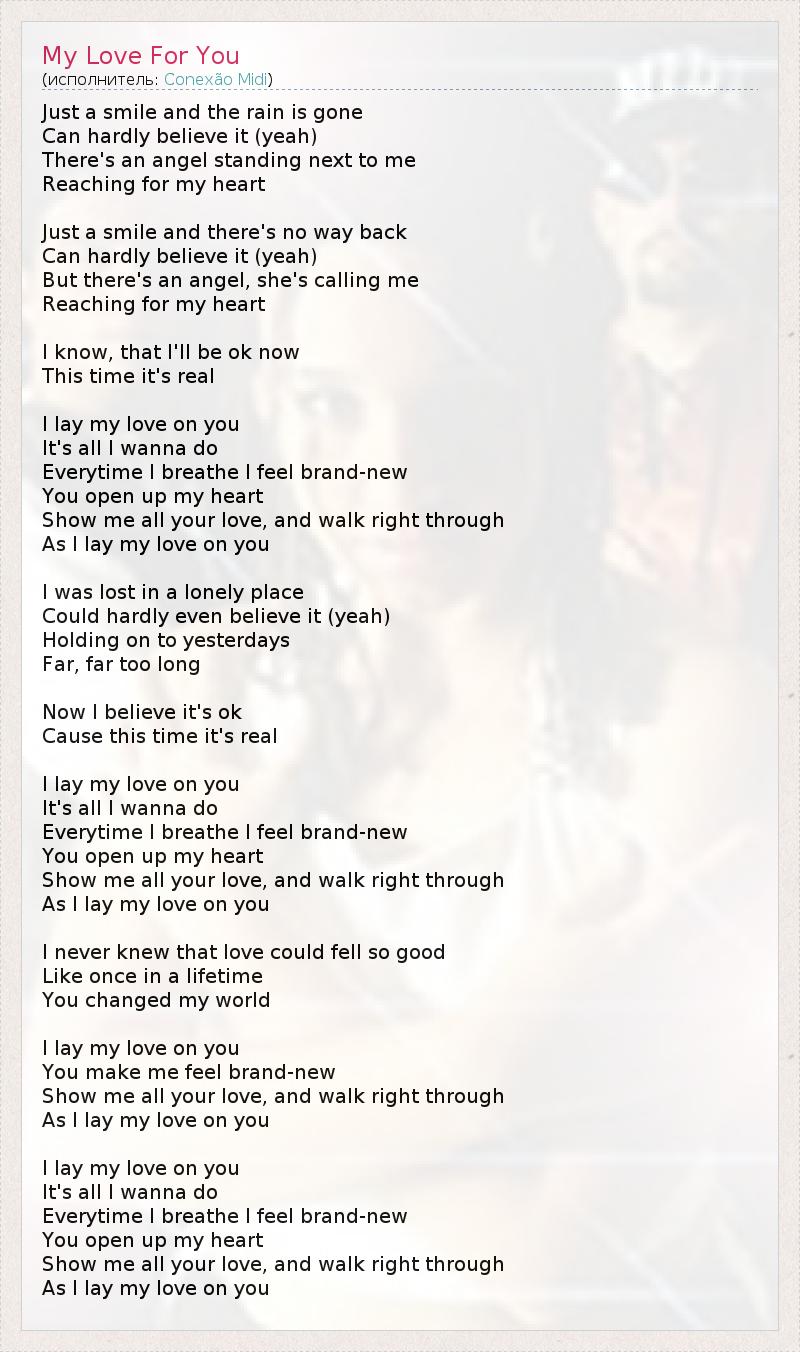 Just a smile and the rain is gone Can hardly believe it (yeah) There's an angel standing next to me Reaching for my heart Just a smile and there's no way back Can hardly believe it (yeah) But there's an angel, she's calling me Reaching for my heart I know, that I'll be ok now This time it's real I lay my love on you It's all I wanna do Everytime I breathe I feel brand-new You open up my heart Show me all your love, and walk right through As I lay my love on you I was lost in a lonely place Could hardly even believe it (yeah) Holding on to yesterdays Far, far too long Now I believe it's ok Cause this time it's real I lay my love on you It's all I wanna do Everytime I breathe I feel brand-new You open up my heart Show me all your love, and walk right through As I lay my love on you I never knew that love could fell so good Like once in a lifetime You changed my world I lay my love on you You make me feel brand-new Show me all your love, and walk right through As I lay my love on you I lay my love on you It's all I wanna do Everytime I breathe I feel brand-new You open up my heart Show me all your love, and walk right through As I lay my love on you