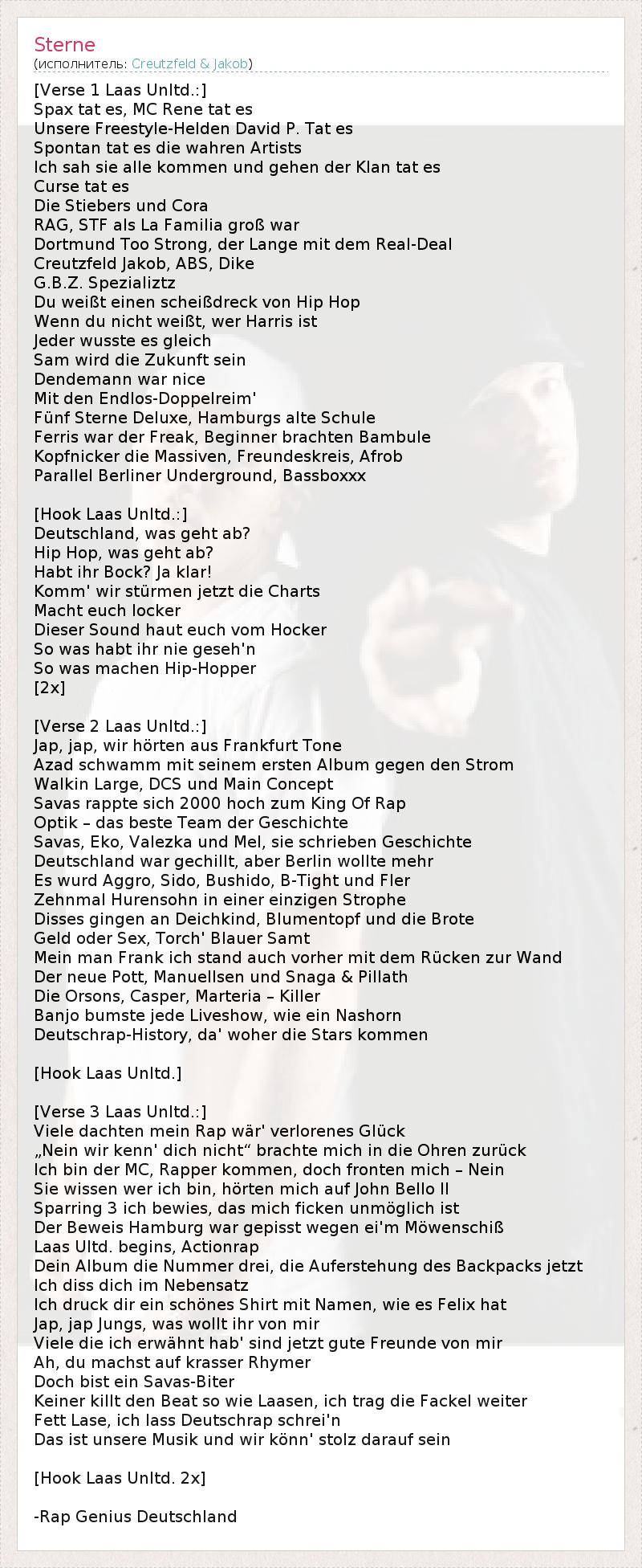 [Verse 1 Laas Unltd.:] Spax tat es, MC Rene tat es Unsere Freestyle-Helden David P. Tat es Spontan tat es die wahren Artists Ich sah sie alle kommen und gehen der Klan tat es Curse tat es Die Stiebers und Cora RAG, STF als La Familia groß war Dortmund Too Strong, der Lange mit dem Real-Deal Creutzfeld Jakob, ABS, Dike G.B.Z. Spezializtz Du weißt einen scheißdreck von Hip Hop Wenn du nicht weißt, wer Harris ist Jeder wusste es gleich Sam wird die Zukunft sein Dendemann war nice Mit den Endlos-Doppelreim' Fünf Sterne Deluxe, Hamburgs alte Schule Ferris war der Freak, Beginner brachten Bambule Kopfnicker die Massiven, Freundeskreis, Afrob Parallel Berliner Underground, Bassboxxx [Hook Laas Unltd.:] Deutschland, was geht ab? Hip Hop, was geht ab? Habt ihr Bock? Ja klar! Komm' wir stürmen jetzt die Charts Macht euch locker Dieser Sound haut euch vom Hocker So was habt ihr nie geseh'n So was machen Hip-Hopper [2x] [Verse 2 Laas Unltd.:] Jap, jap, wir hörten aus Frankfurt Tone Azad schwamm mit seinem ersten Album gegen den Strom Walkin Large, DCS und Main Concept Savas rappte sich 2000 hoch zum King Of Rap Optik – das beste Team der Geschichte Savas, Eko, Valezka und Mel, sie schrieben Geschichte Deutschland war gechillt, aber Berlin wollte mehr Es wurd Aggro, Sido, Bushido, B-Tight und Fler Zehnmal Hurensohn in einer einzigen Strophe Disses gingen an Deichkind, Blumentopf und die Brote Geld oder Sex, Torch' Blauer Samt Mein man Frank ich stand auch vorher mit dem Rücken zur Wand Der neue Pott, Manuellsen und Snaga & Pillath Die Orsons, Casper, Marteria – Killer Banjo bumste jede Liveshow, wie ein Nashorn Deutschrap-History, da' woher die Stars kommen [Hook Laas Unltd.] [Verse 3 Laas Unltd.:] Viele dachten mein Rap wär' verlorenes Glück „Nein wir kenn' dich nicht“ brachte mich in die Ohren zurück Ich bin der MC, Rapper kommen, doch fronten mich – Nein Sie wissen wer ich bin, hörten mich auf John Bello II Sparring 3 ich bewies, das mich ficken unmöglich ist Der Beweis Hamburg war gepisst wegen ei'm Möwenschiß Laas Ultd. begins, Actionrap Dein Album die Nummer drei, die Auferstehung des Backpacks jetzt Ich diss dich im Nebensatz Ich druck dir ein schönes Shirt mit Namen, wie es Felix hat Jap, jap Jungs, was wollt ihr von mir Viele die ich erwähnt hab' sind jetzt gute Freunde von mir Ah, du machst auf krasser Rhymer Doch bist ein Savas-Biter Keiner killt den Beat so wie Laasen, ich trag die Fackel weiter Fett Lase, ich lass Deutschrap schrei'n Das ist unsere Musik und wir könn' stolz darauf sein [Hook Laas Unltd. 2x] -Rap Genius Deutschland