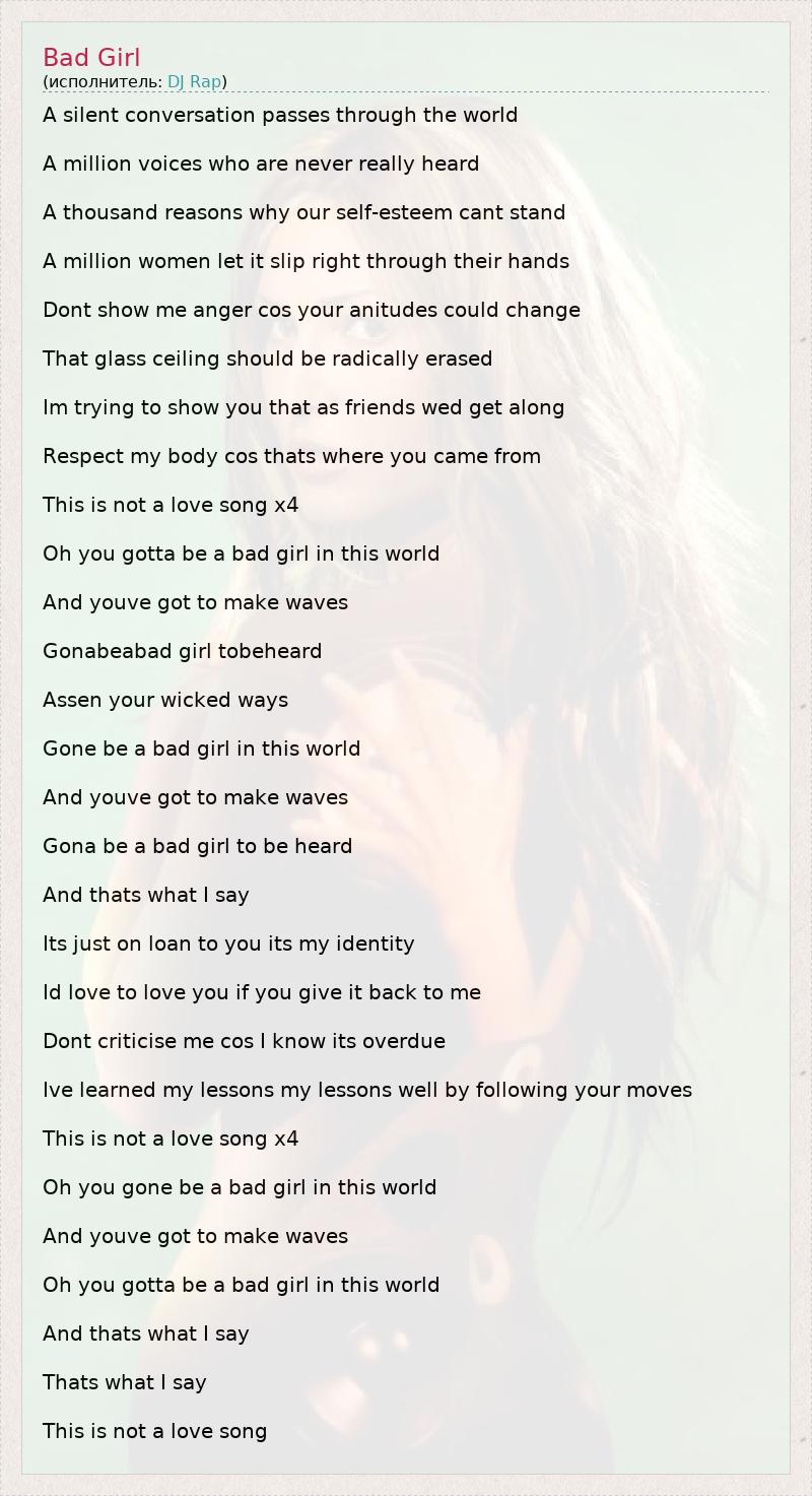 A silent conversation passes through the world A million voices who are never really heard A thousand reasons why our self-esteem cant stand A million women let it slip right through their hands Dont show me anger cos your anitudes could change That glass ceiling should be radically erased Im trying to show you that as friends wed get along Respect my body cos thats where you came from This is not a love song x4 Oh you gotta be a bad girl in this world And youve got to make waves Gonabeabad girl tobeheard Assen your wicked ways Gone be a bad girl in this world And youve got to make waves Gona be a bad girl to be heard And thats what I say Its just on loan to you its my identity Id love to love you if you give it back to me Dont criticise me cos I know its overdue Ive learned my lessons my lessons well by following your moves This is not a love song x4 Oh you gone be a bad girl in this world And youve got to make waves Oh you gotta be a bad girl in this world And thats what I say Thats what I say This is not a love song