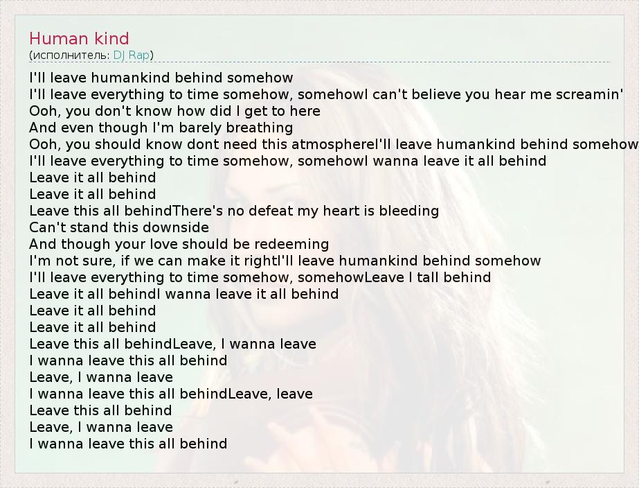 I'll leave humankind behind somehow I'll leave everything to time somehow, somehowI can't believe you hear me screamin' Ooh, you don't know how did I get to here And even though I'm barely breathing Ooh, you should know dont need this atmosphereI'll leave humankind behind somehow I'll leave everything to time somehow, somehowI wanna leave it all behind Leave it all behind Leave it all behind Leave this all behindThere's no defeat my heart is bleeding Can't stand this downside And though your love should be redeeming I'm not sure, if we can make it rightI'll leave humankind behind somehow I'll leave everything to time somehow, somehowLeave I tall behind Leave it all behindI wanna leave it all behind Leave it all behind Leave it all behind Leave this all behindLeave, I wanna leave I wanna leave this all behind Leave, I wanna leave I wanna leave this all behindLeave, leave Leave this all behind Leave, I wanna leave I wanna leave this all behind
