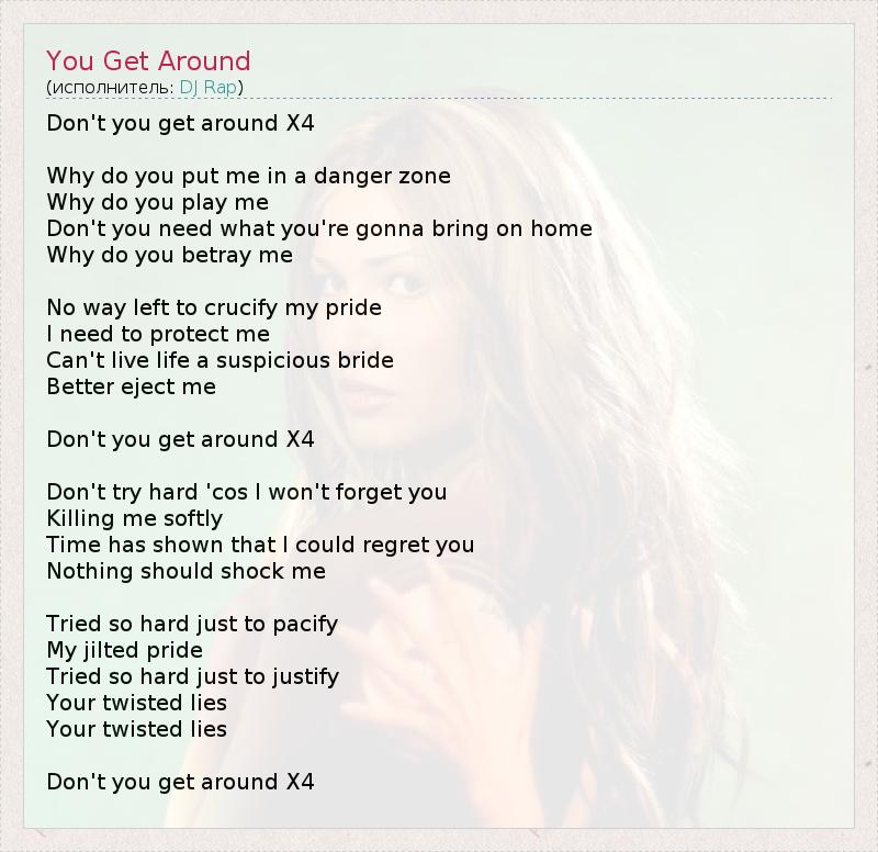 Don't you get around X4 Why do you put me in a danger zone Why do you play me Don't you need what you're gonna bring on home Why do you betray me No way left to crucify my pride I need to protect me Can't live life a suspicious bride Better eject me Don't you get around X4 Don't try hard 'cos I won't forget you Killing me softly Time has shown that I could regret you Nothing should shock me Tried so hard just to pacify My jilted pride Tried so hard just to justify Your twisted lies Your twisted lies Don't you get around X4