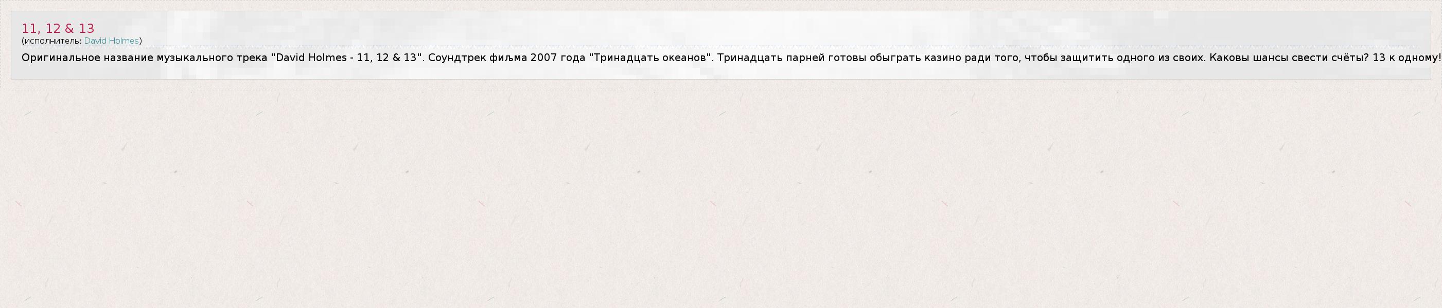 Оригинальное название музыкального трека "David Holmes - 11, 12 & 13". Соундтрек фиљма 2007 года "Тринадцать океанов". Тринадцать парней готовы обыграть казино ради того, чтобы защитить одного из своих. Каковы шансы свести счёты? 13 к одному!