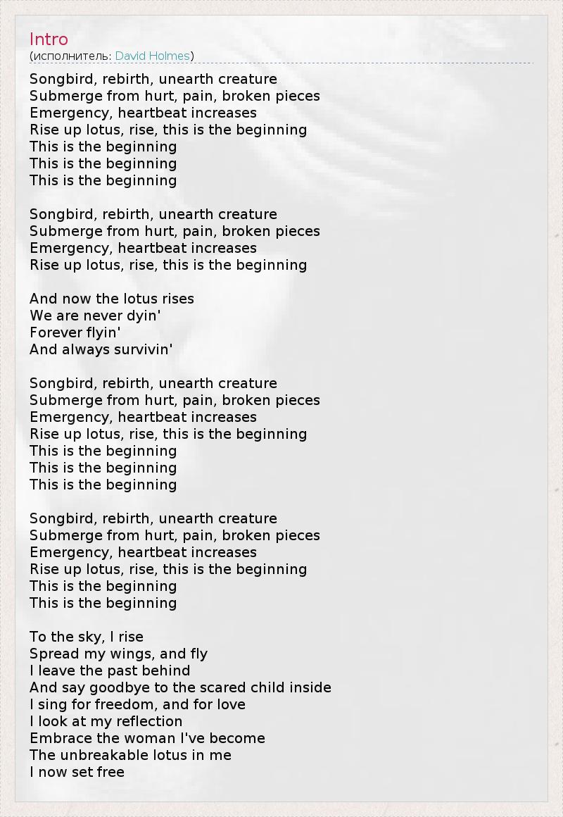 Songbird, rebirth, unearth creature Submerge from hurt, pain, broken pieces Emergency, heartbeat increases Rise up lotus, rise, this is the beginning This is the beginning This is the beginning This is the beginning Songbird, rebirth, unearth creature Submerge from hurt, pain, broken pieces Emergency, heartbeat increases Rise up lotus, rise, this is the beginning And now the lotus rises We are never dyin' Forever flyin' And always survivin' Songbird, rebirth, unearth creature Submerge from hurt, pain, broken pieces Emergency, heartbeat increases Rise up lotus, rise, this is the beginning This is the beginning This is the beginning This is the beginning Songbird, rebirth, unearth creature Submerge from hurt, pain, broken pieces Emergency, heartbeat increases Rise up lotus, rise, this is the beginning This is the beginning This is the beginning To the sky, I rise Spread my wings, and fly I leave the past behind And say goodbye to the scared child inside I sing for freedom, and for love I look at my reflection Embrace the woman I've become The unbreakable lotus in me I now set free
