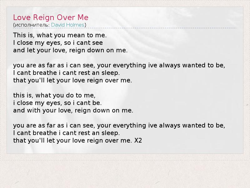This is, what you mean to me. I close my eyes, so i cant see and let your love, reign down on me. you are as far as i can see, your everything ive always wanted to be, I cant breathe i cant rest an sleep. that you'll let your love reign over me. this is, what you do to me, i close my eyes, so i cant be. and with your love, reign down on me. you are as far as i can see, your everything ive always wanted to be, I cant breathe i cant rest an sleep. that you'll let your love reign over me. X2