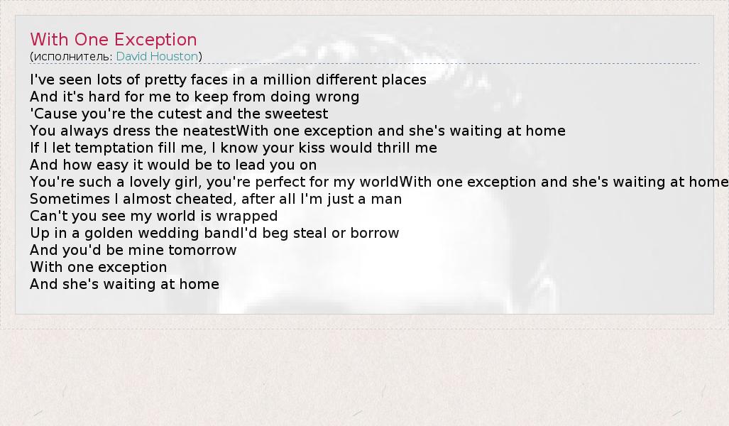 You're such a lovely girl, you're perfect for my worldWith one exception and she's waiting at home