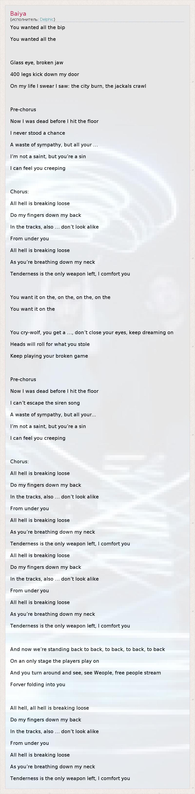 You wanted all the bip You wanted all the Glass eye, broken jaw 400 legs kick down my door On my life I swear I saw: the city burn, the jackals crawl Pre-chorus Now I was dead before I hit the floor I never stood a chance A waste of sympathy, but all your … I’m not a saint, but you’re a sin I can feel you creeping Chorus: All hell is breaking loose Do my fingers down my back In the tracks, also … don’t look alike From under you All hell is breaking loose As you’re breathing down my neck Tenderness is the only weapon left, I comfort you You want it on the, on the, on the, on the You want it on the You cry-wolf, you get a …, don’t close your eyes, keep dreaming on Heads will roll for what you stole Keep playing your broken game Pre-chorus Now I was dead before I hit the floor I can’t escape the siren song A waste of sympathy, but all your... I’m not a saint, but you’re a sin I can feel you creeping Chorus: All hell is breaking loose Do my fingers down my back In the tracks, also … don’t look alike From under you All hell is breaking loose As you’re breathing down my neck Tenderness is the only weapon left, I comfort you All hell is breaking loose Do my fingers down my back In the tracks, also … don’t look alike From under you All hell is breaking loose As you’re breathing down my neck Tenderness is the only weapon left, I comfort you And now we’re standing back to back, to back, to back, to back On an only stage the players play on And you turn around and see, see Weople, free people stream Forver folding into you All hell, all hell is breaking loose Do my fingers down my back In the tracks, also … don’t look alike From under you All hell is breaking loose As you’re breathing down my neck Tenderness is the only weapon left, I comfort you