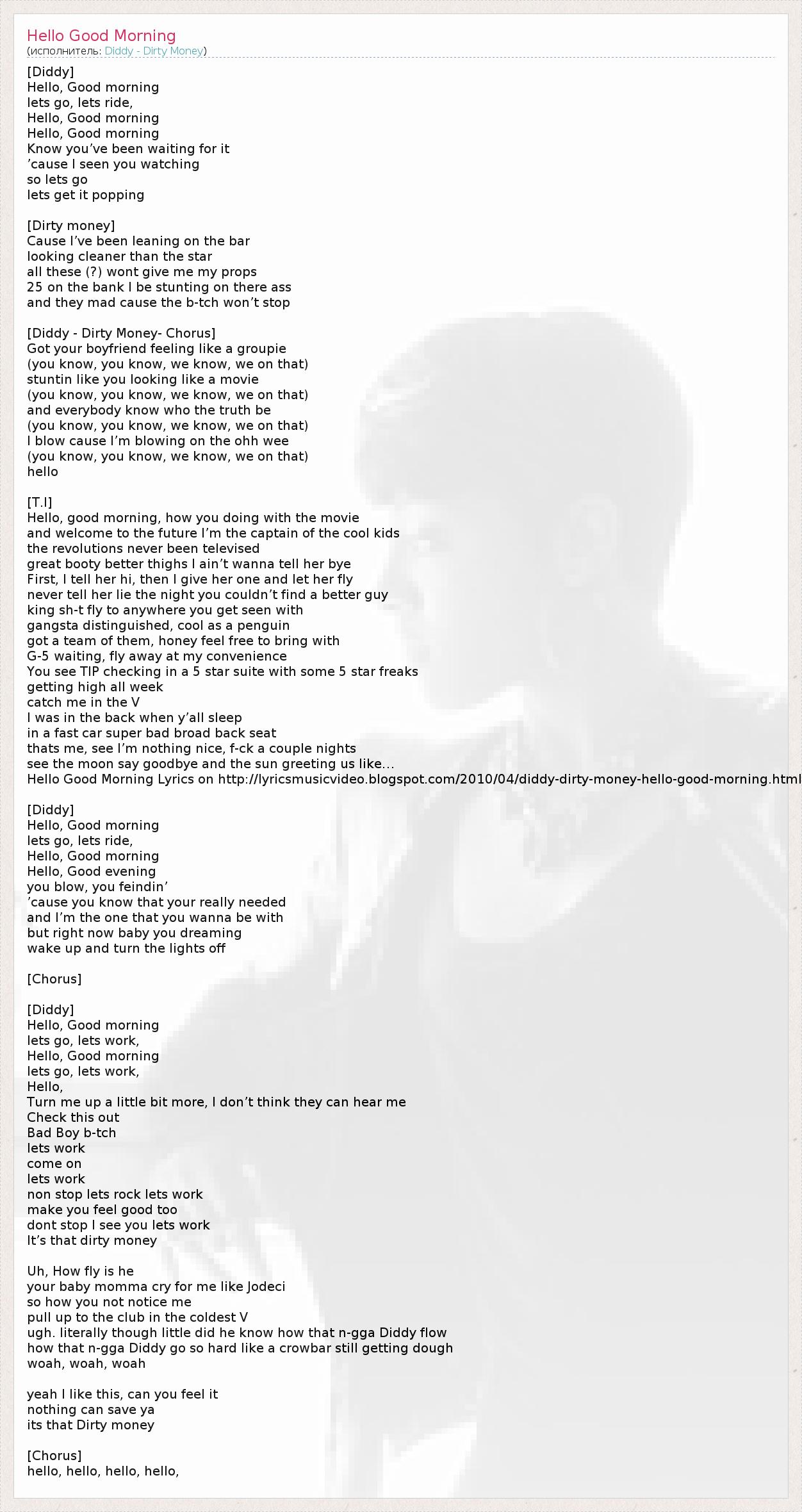 Hello Good Morning Lyrics on http://lyricsmusicvideo.blogspot.com/2010/04/diddy-dirty-money-hello-good-morning.html