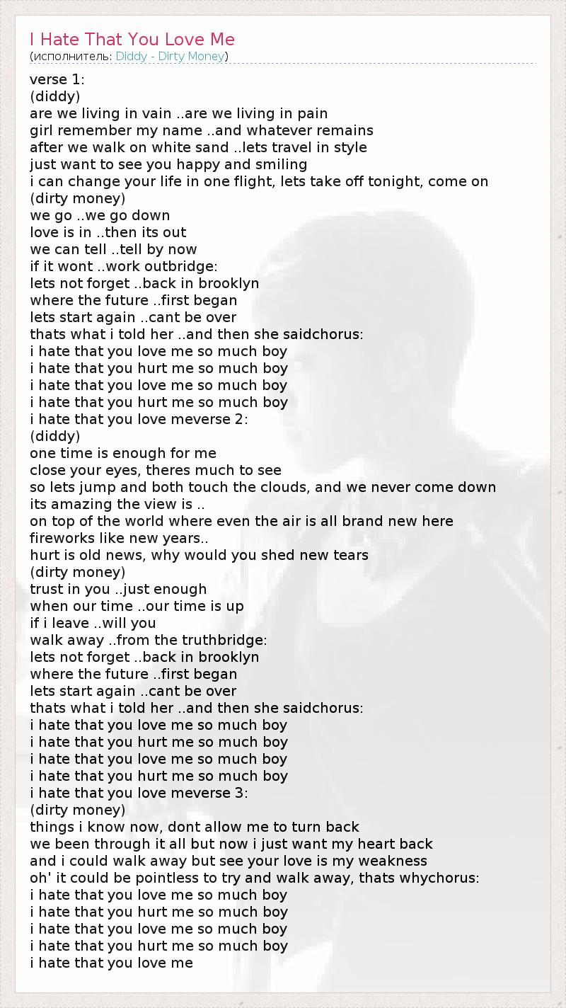 verse 1: (diddy) are we living in vain ..are we living in pain girl remember my name ..and whatever remains after we walk on white sand ..lets travel in style just want to see you happy and smiling i can change your life in one flight, lets take off tonight, come on (dirty money) we go ..we go down love is in ..then its out we can tell ..tell by now if it wont ..work outbridge: lets not forget ..back in brooklyn where the future ..first began lets start again ..cant be over thats what i told her ..and then she saidchorus: i hate that you love me so much boy i hate that you hurt me so much boy i hate that you love me so much boy i hate that you hurt me so much boy i hate that you love meverse 2: (diddy) one time is enough for me close your eyes, theres much to see so lets jump and both touch the clouds, and we never come down its amazing the view is .. on top of the world where even the air is all brand new here fireworks like new years.. hurt is old news, why would you shed new tears (dirty money) trust in you ..just enough when our time ..our time is up if i leave ..will you walk away ..from the truthbridge: lets not forget ..back in brooklyn where the future ..first began lets start again ..cant be over thats what i told her ..and then she saidchorus: i hate that you love me so much boy i hate that you hurt me so much boy i hate that you love me so much boy i hate that you hurt me so much boy i hate that you love meverse 3: (dirty money) things i know now, dont allow me to turn back we been through it all but now i just want my heart back and i could walk away but see your love is my weakness oh' it could be pointless to try and walk away, thats whychorus: i hate that you love me so much boy i hate that you hurt me so much boy i hate that you love me so much boy i hate that you hurt me so much boy i hate that you love me